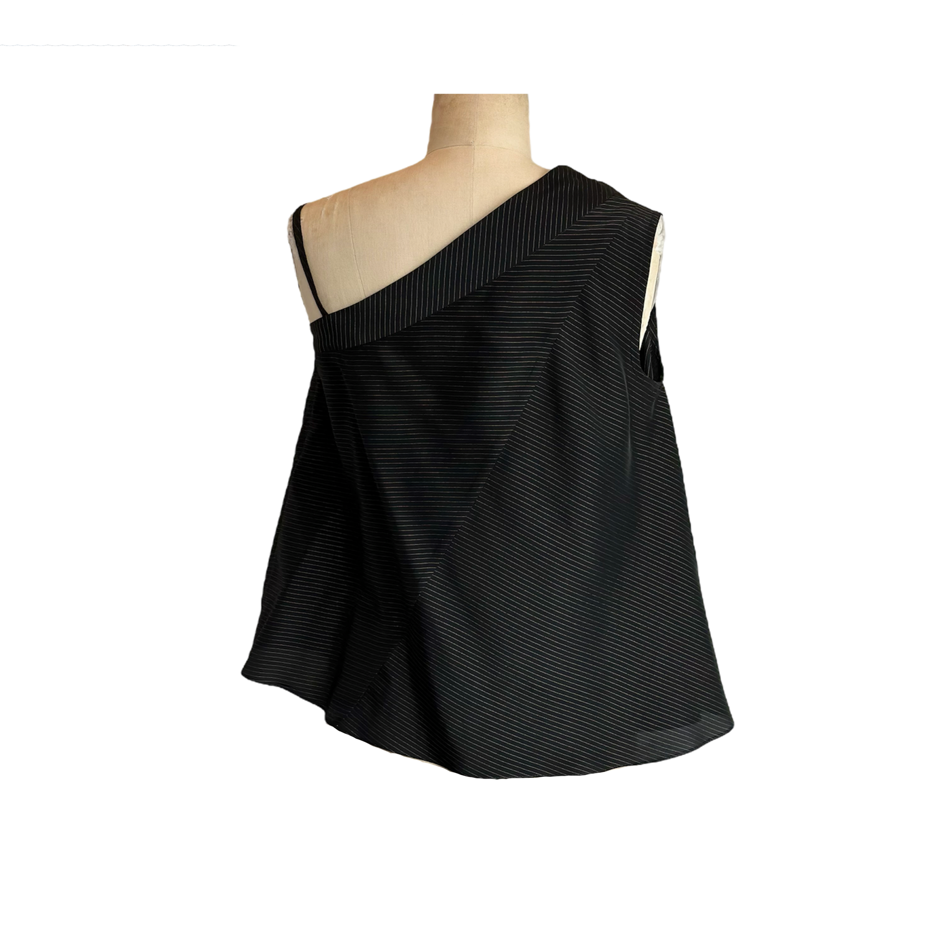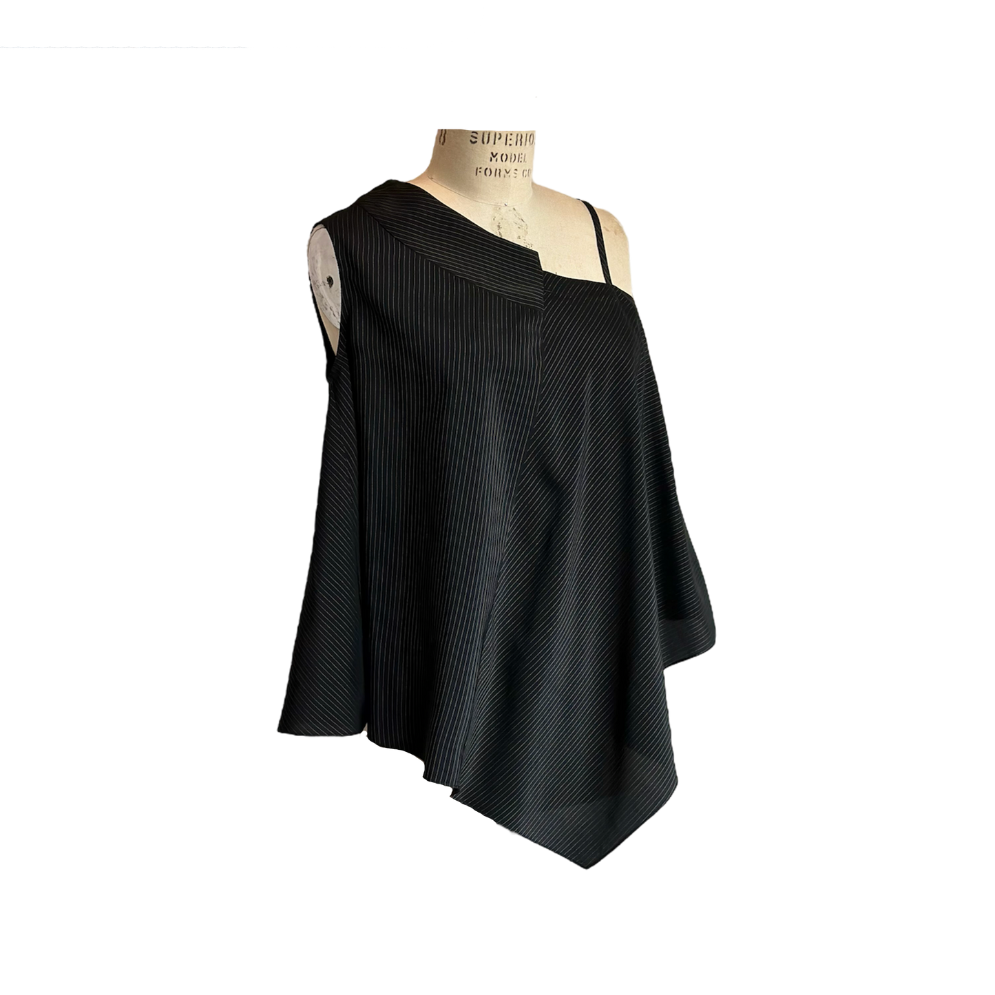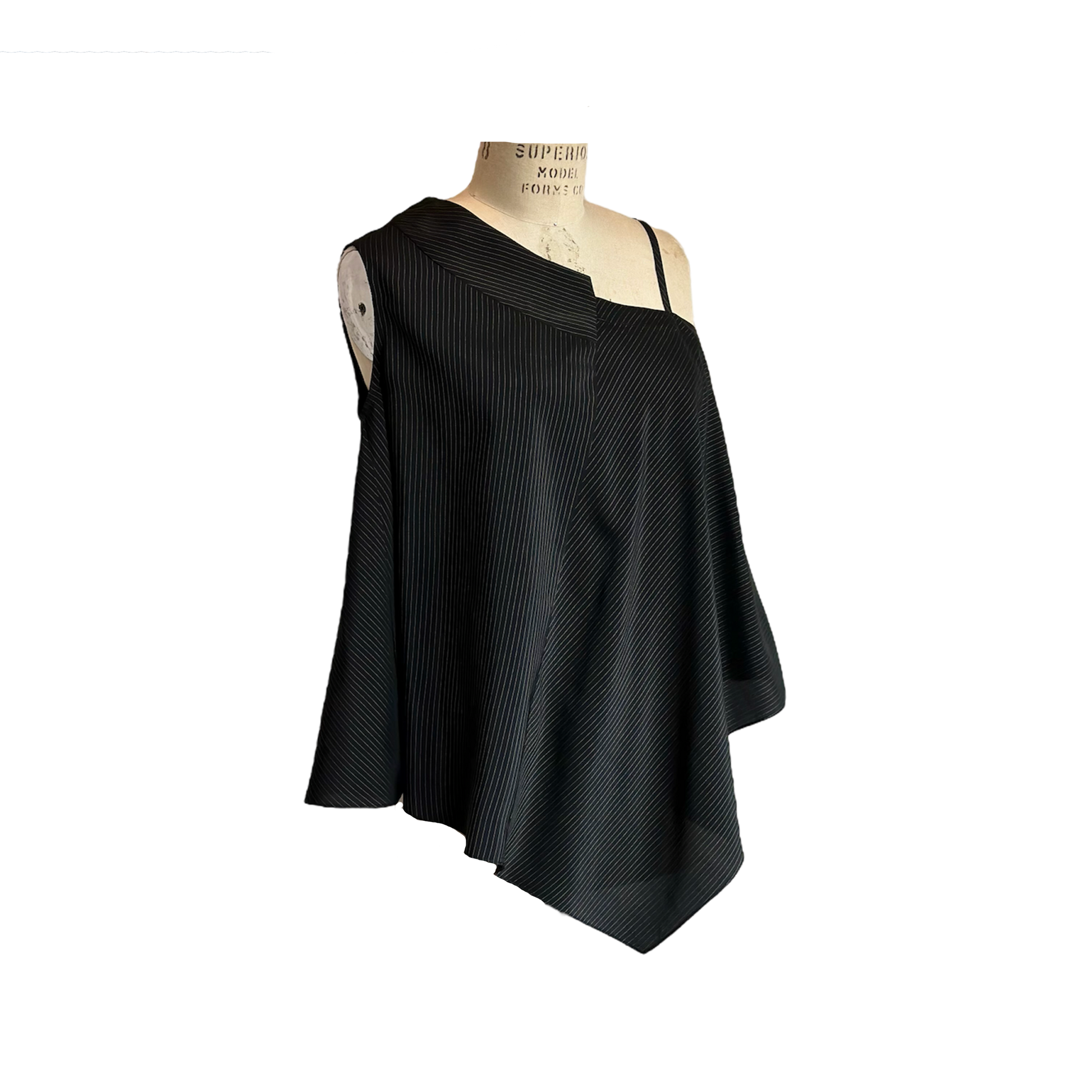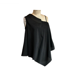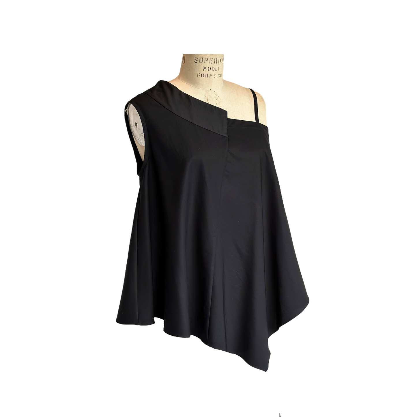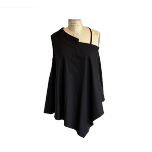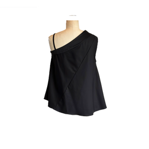 Asymmetrical and architectural, this draped sleeveless top reimagines modern minimalism with sculptural ease. A bold neckline composed of structured collar and delicate strap plays with contrast, while the flowing silhouette creates effortless movement. Designed with an edge of quiet drama, it balances sharp tailoring with fluid femininity. Cut from a lightweight, softly structured fabric that holds its shape, this piece flatters and floats in equal measure. Finished in timeless black for endless versatility.