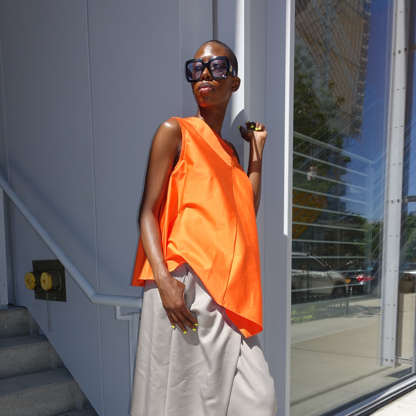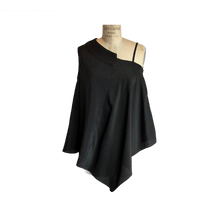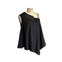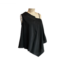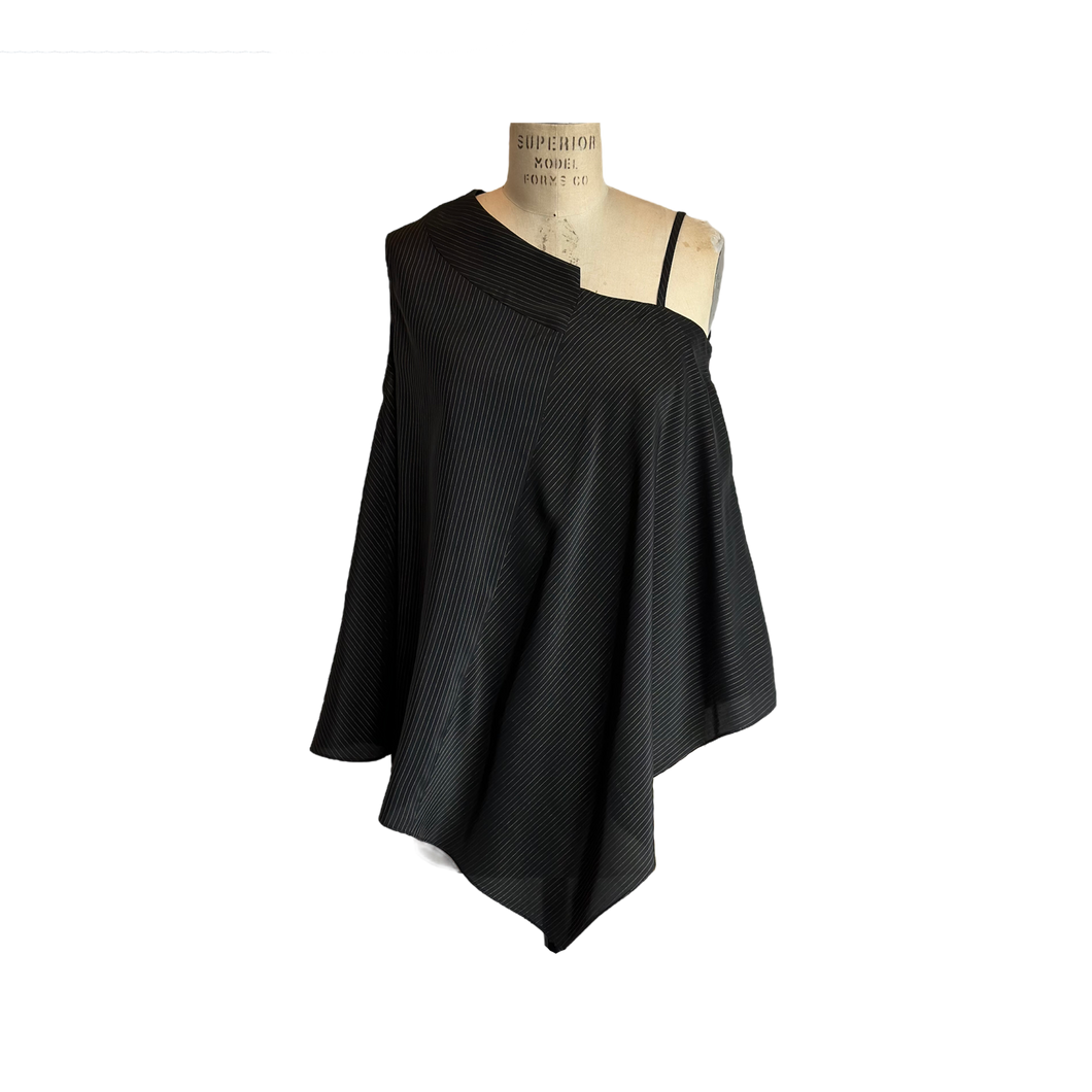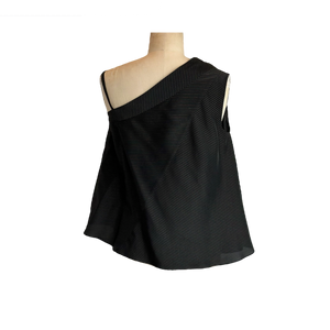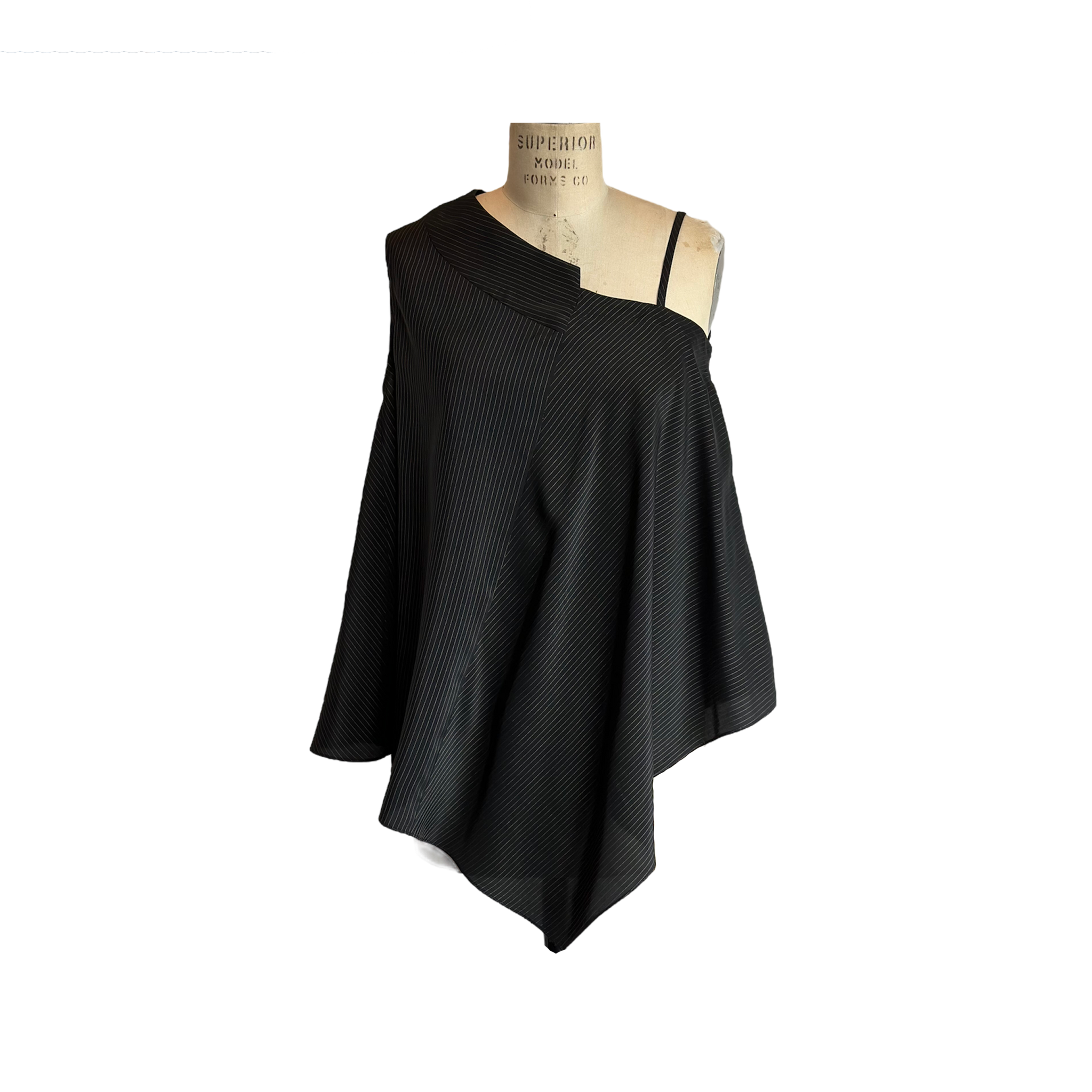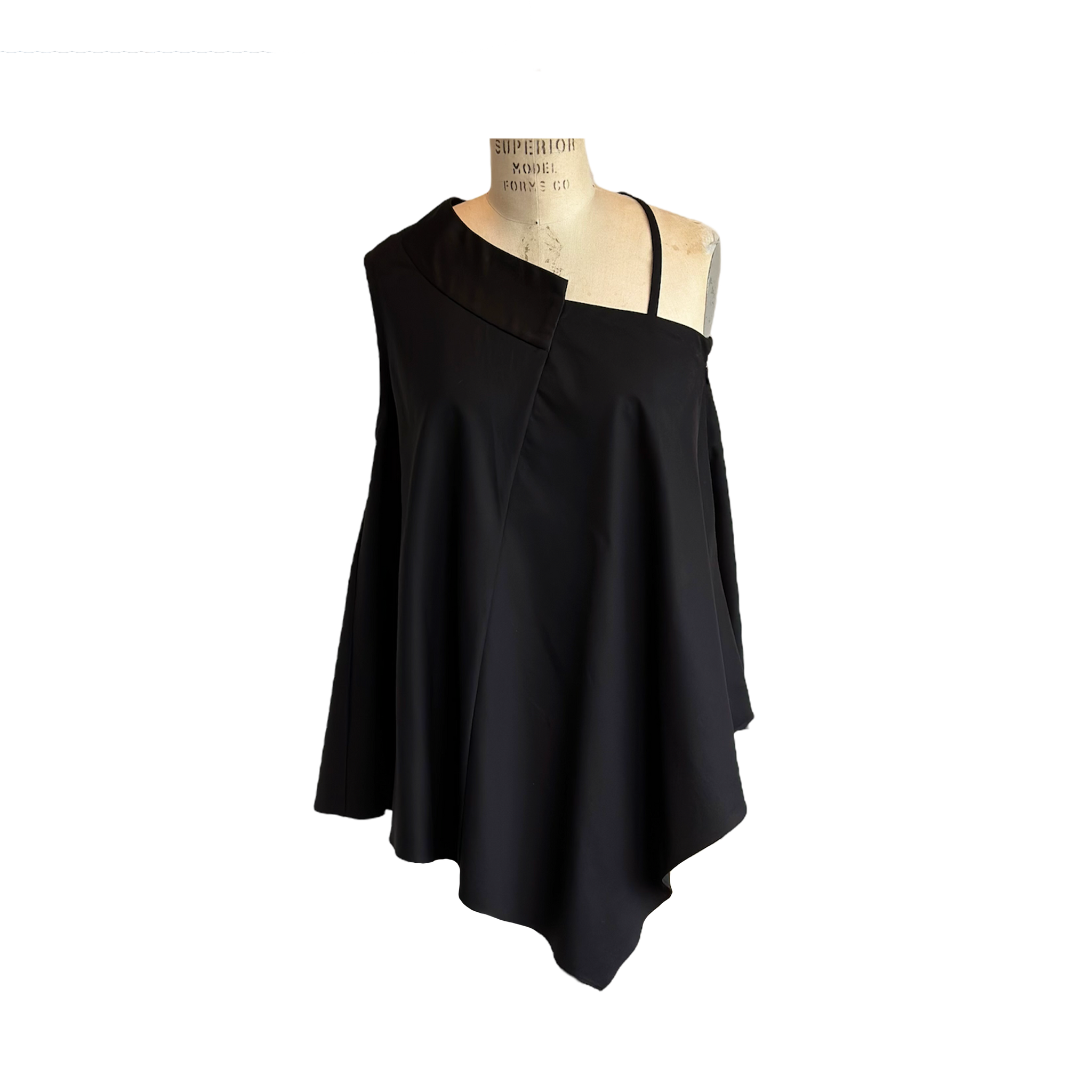 Asymmetrical and architectural, this draped sleeveless top reimagines modern minimalism with sculptural ease. A bold neckline composed of structured collar and delicate strap plays with contrast, while the flowing silhouette creates effortless movement. Designed with an edge of quiet drama, it balances sharp tailoring with fluid femininity. Cut from a lightweight, softly structured fabric that holds its shape, this piece flatters and floats in equal measure. Finished in timeless black for endless versatility.