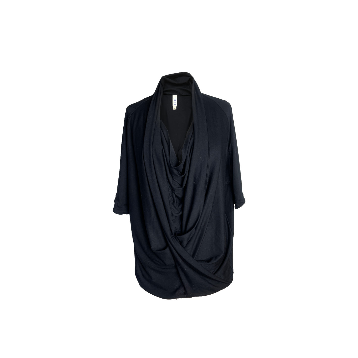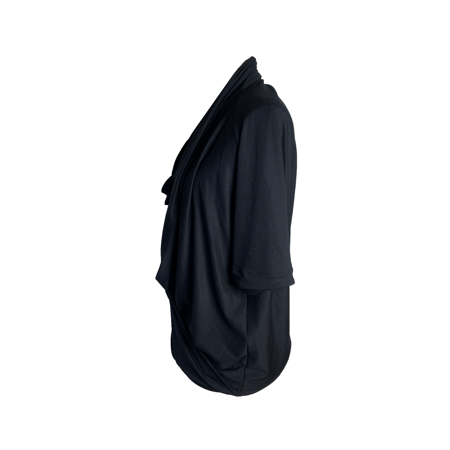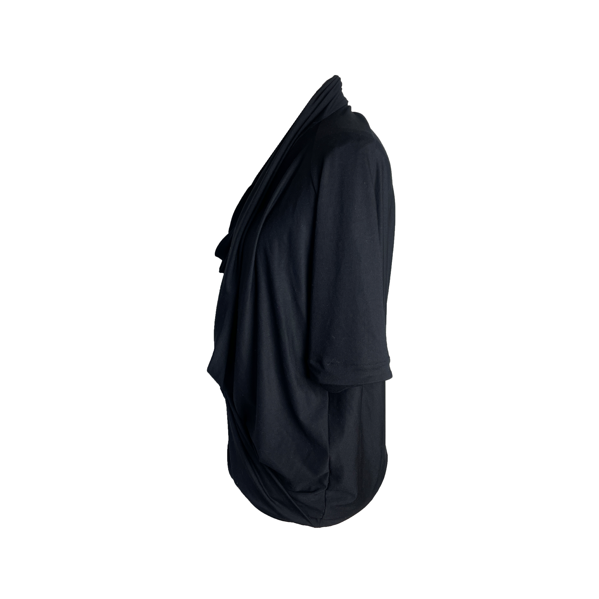 Draped short sleeve top that comfortably dresses you up or casually down. Very flattering, hides any flaws with unique drapery made of luxurious 90% Viscose and 10% Lycra. For now, this comes in black only.