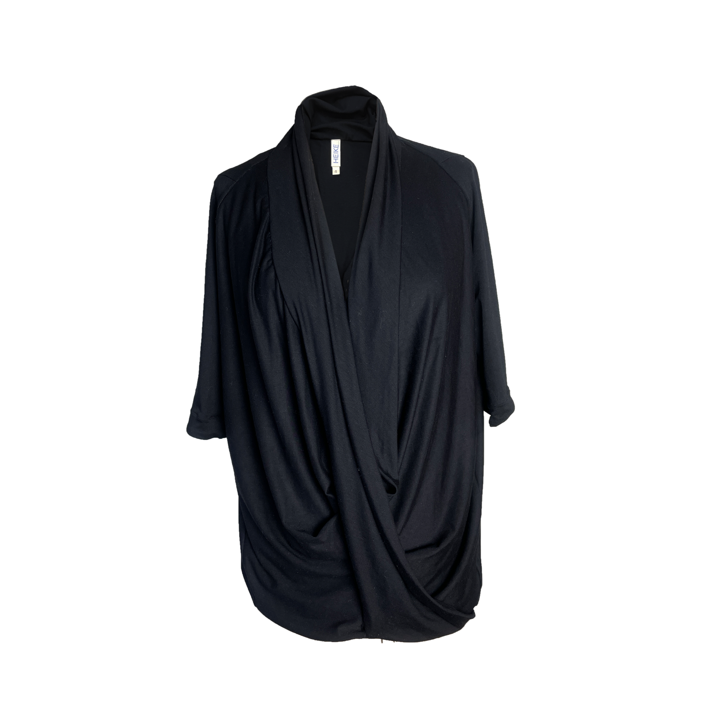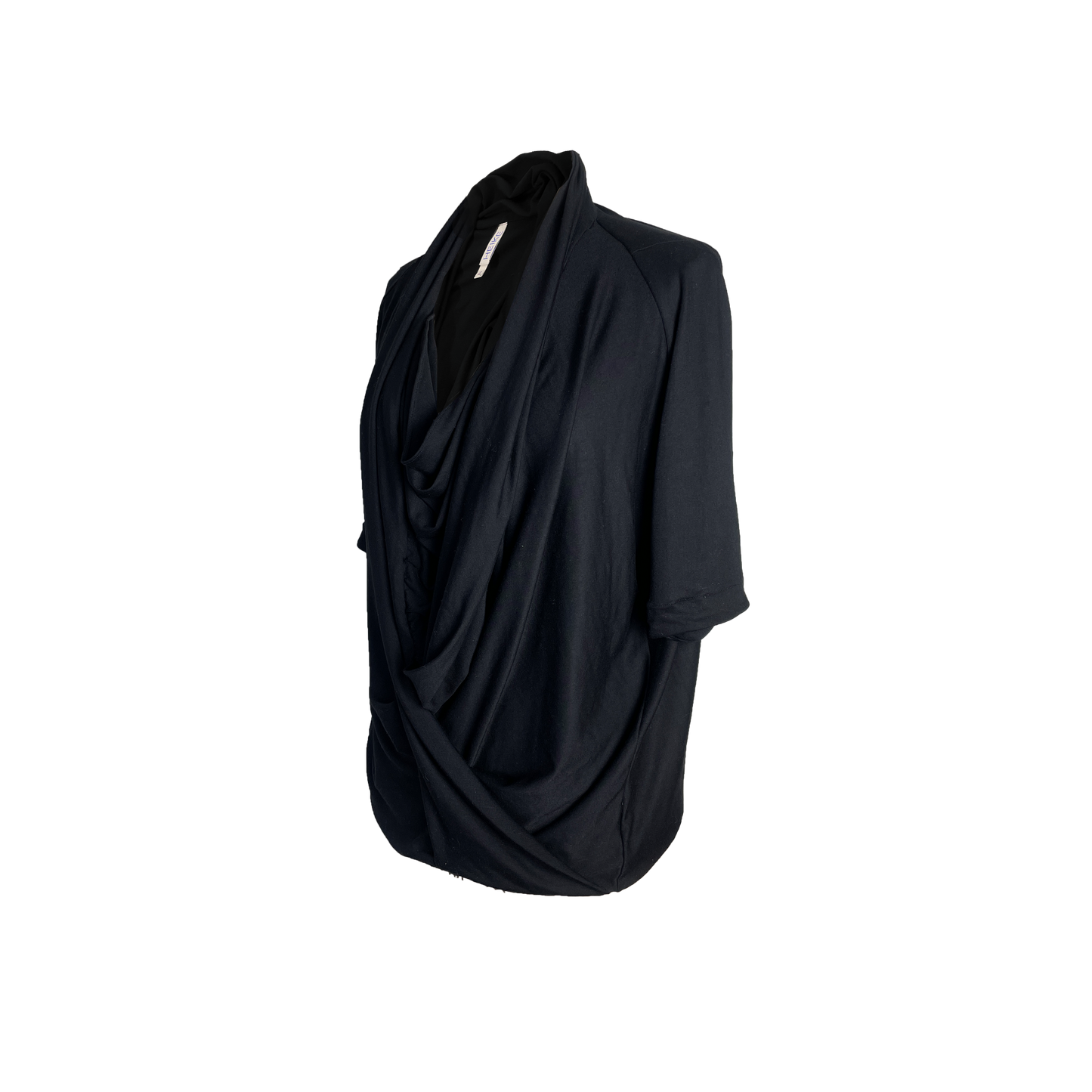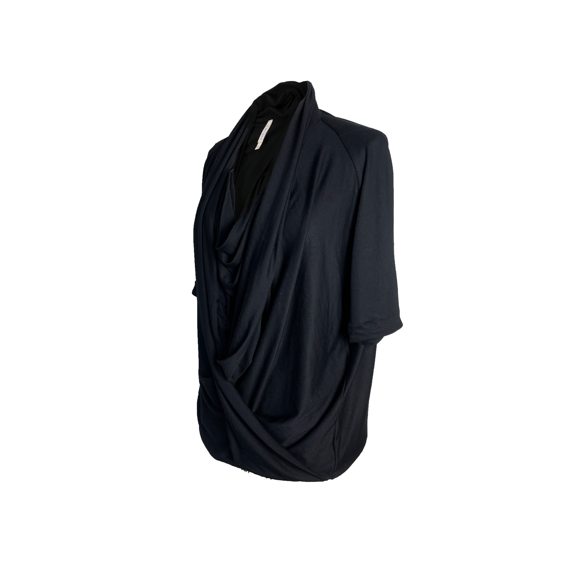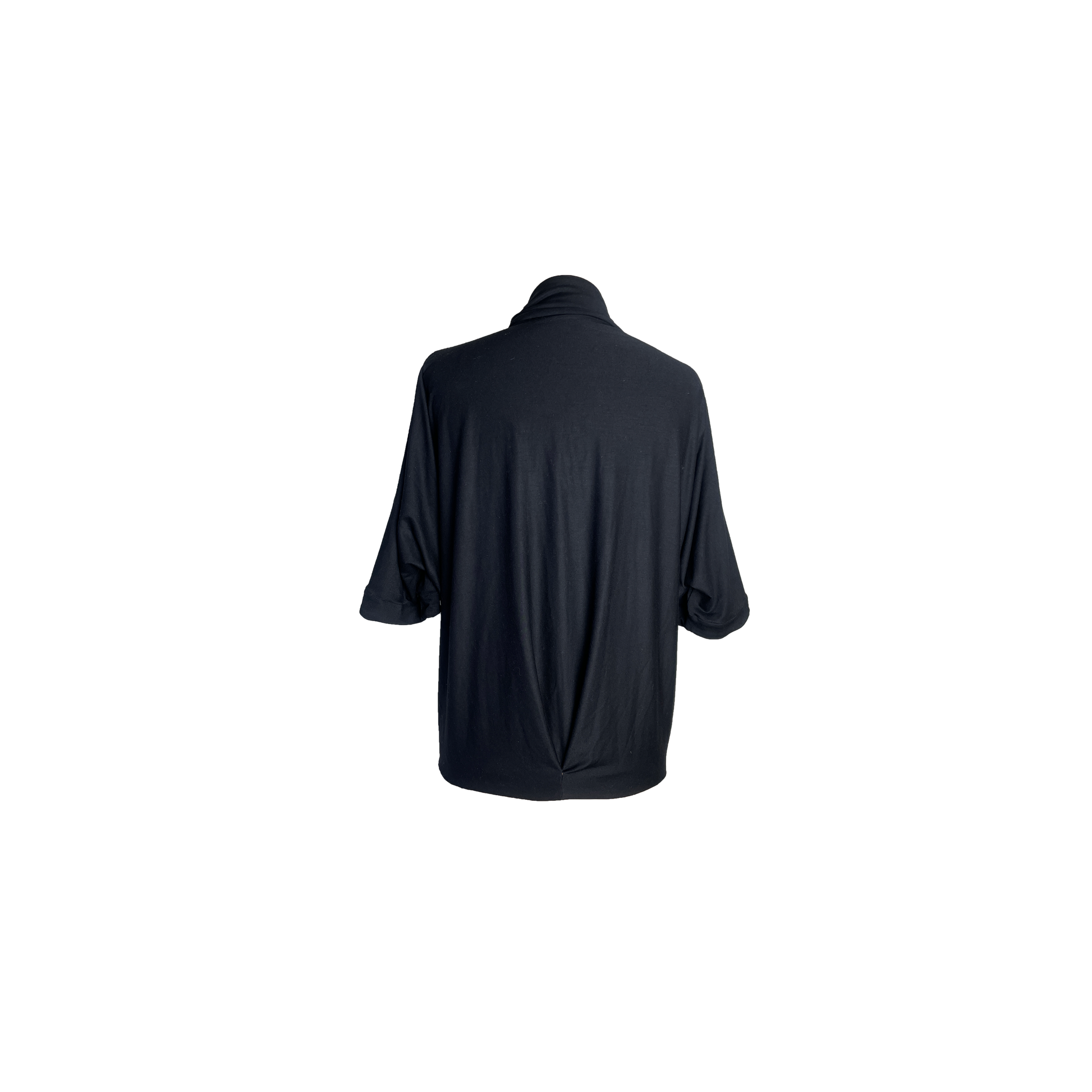 Draped short sleeve top that comfortably dresses you up or casually down. Very flattering, hides any flaws with unique drapery made of luxurious 90% Viscose and 10% Lycra. For now, this comes in black only.