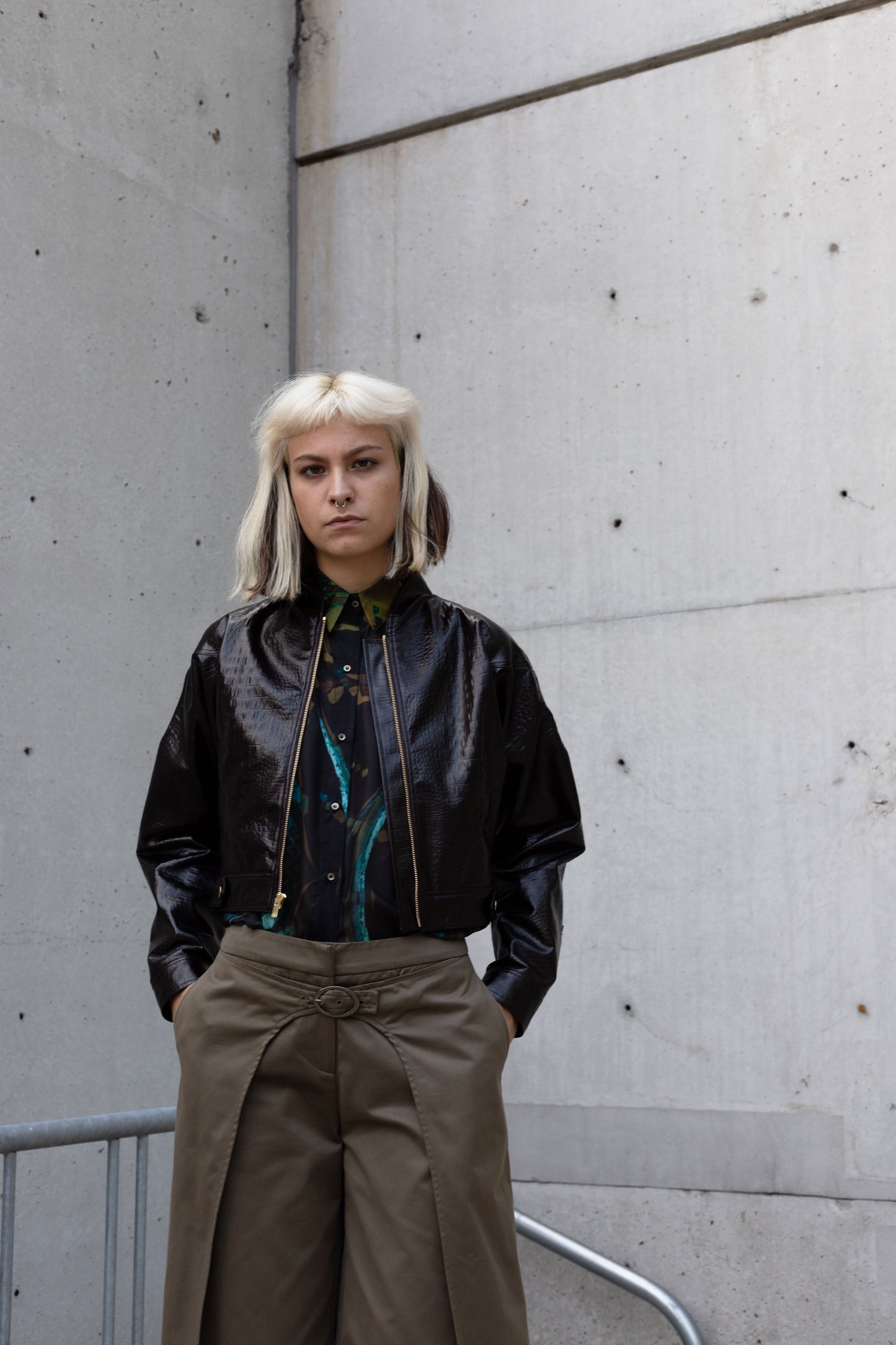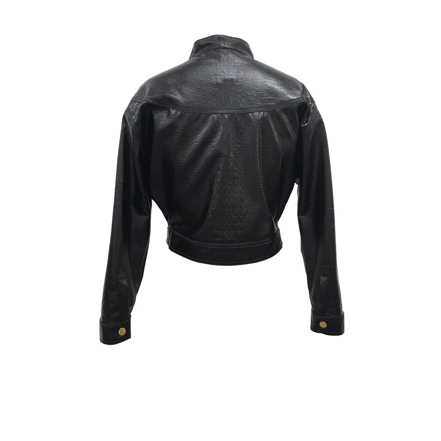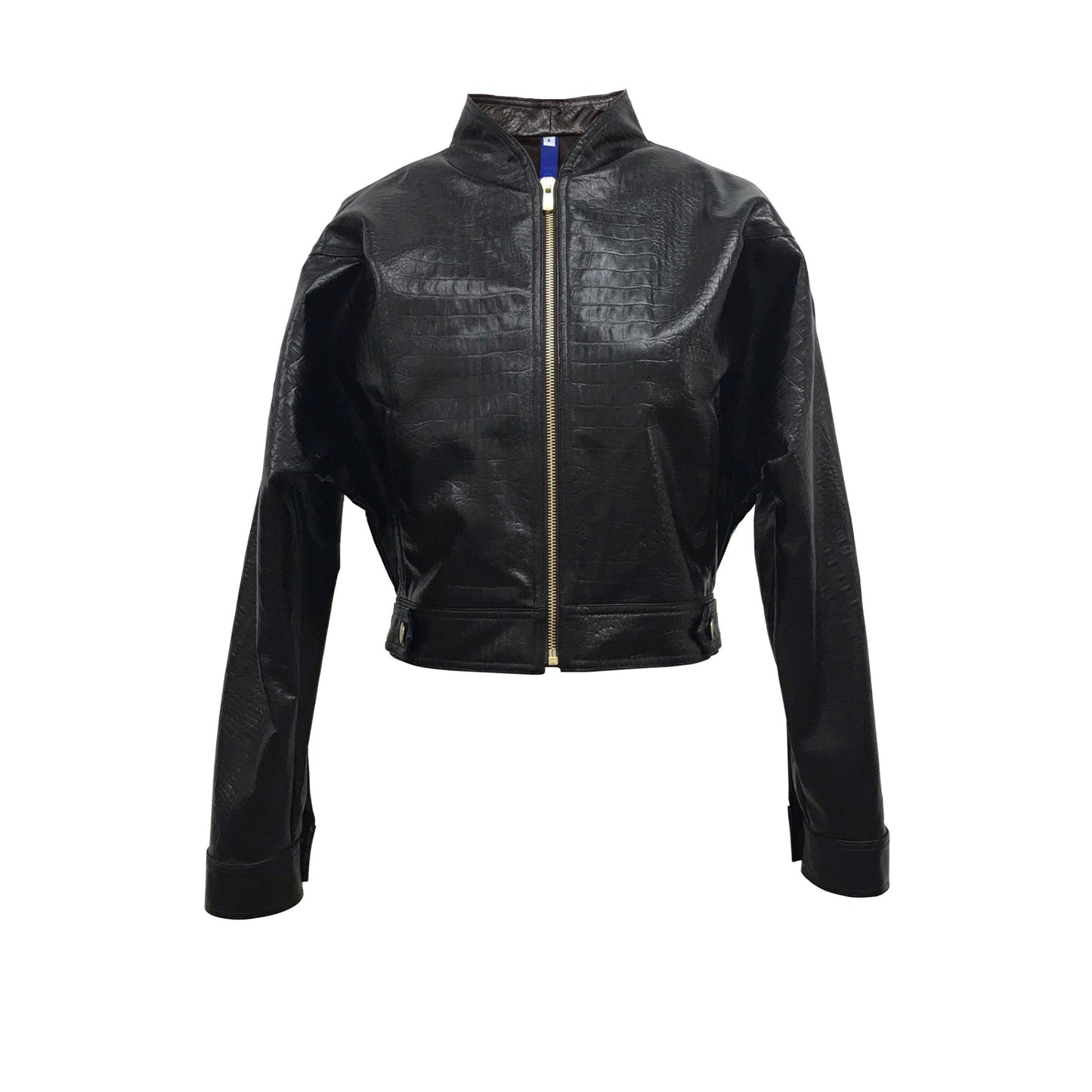 The Cannes jacket is an 80s style cropped waist jacket. Cut from an embossed and coated crocodile pattern on a cotton herringbone fabric, it is water repellent. Made with a modern silhouette with detailed seaming, it is flattering on all body shapes.