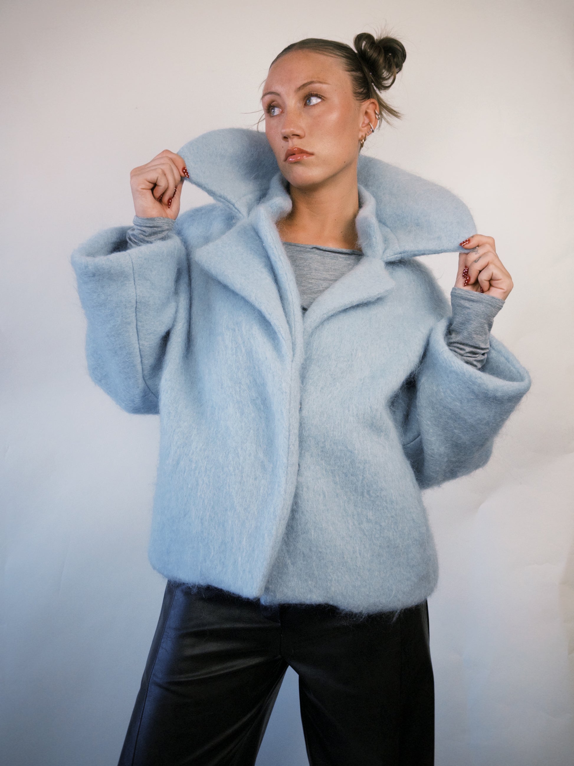 Cropped kimono sleeved coat with double collar detail. Made from a luxurious alpaca wool and mohair blend in an eye-catching Lime green.