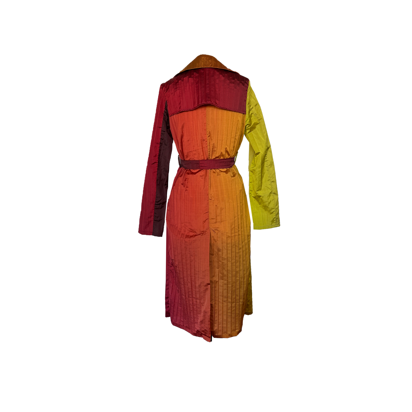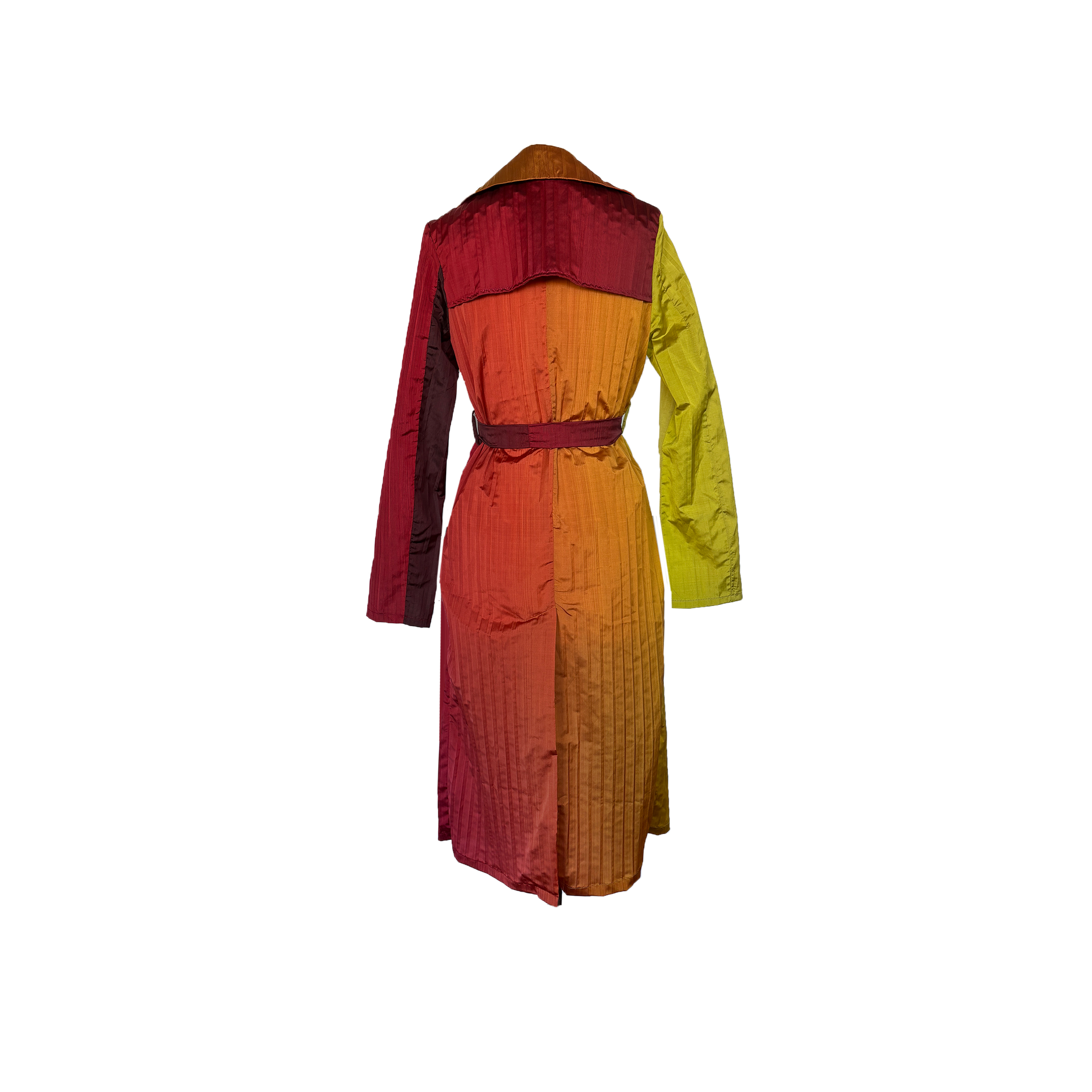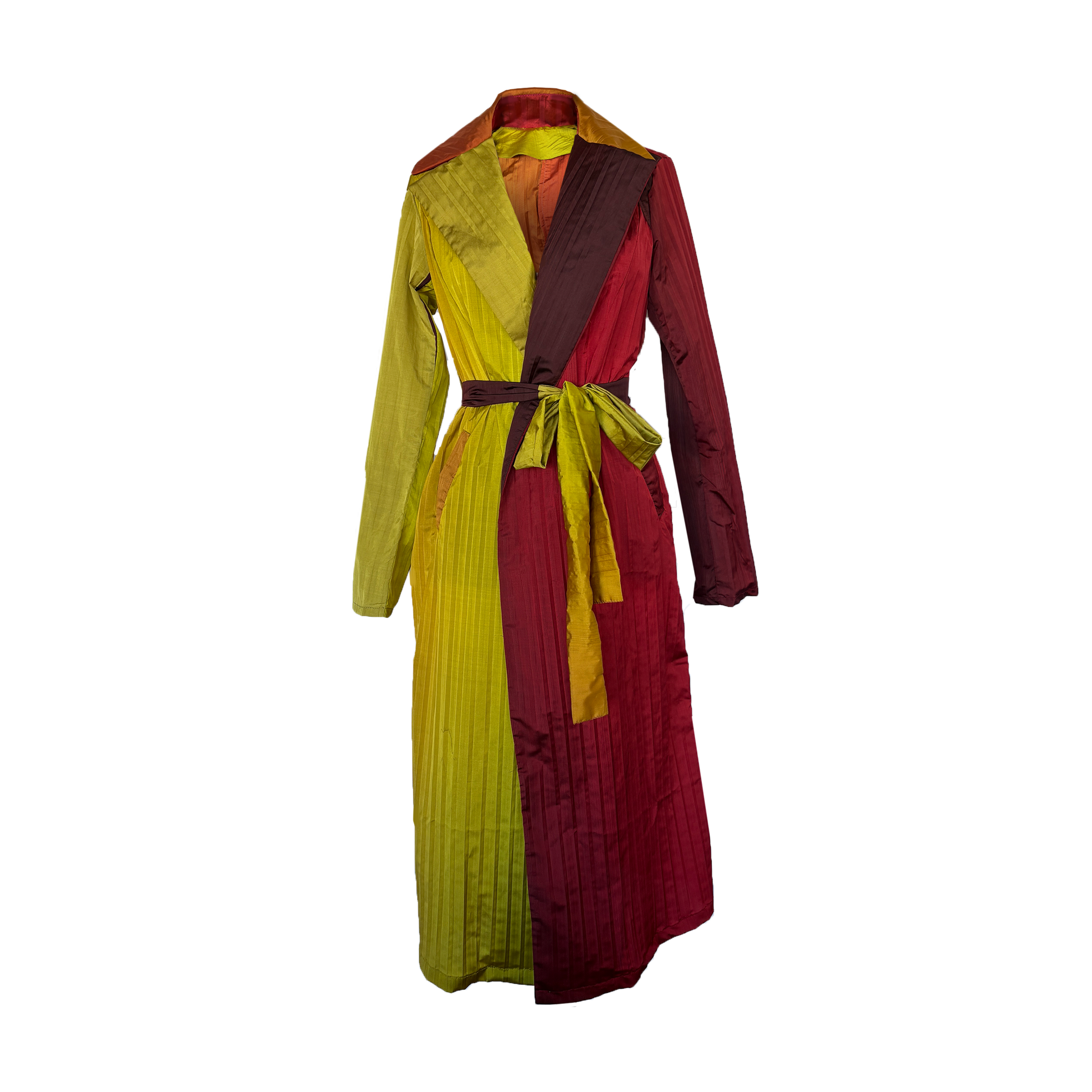 The Iris Trench Coat is a lightweight ombre pleated duster, that can be worn from day to evening. It is shaded from red to yellow, and the color folds in a random beautiful manner. Perfect for layering in the spring, add this piece to your collection today!