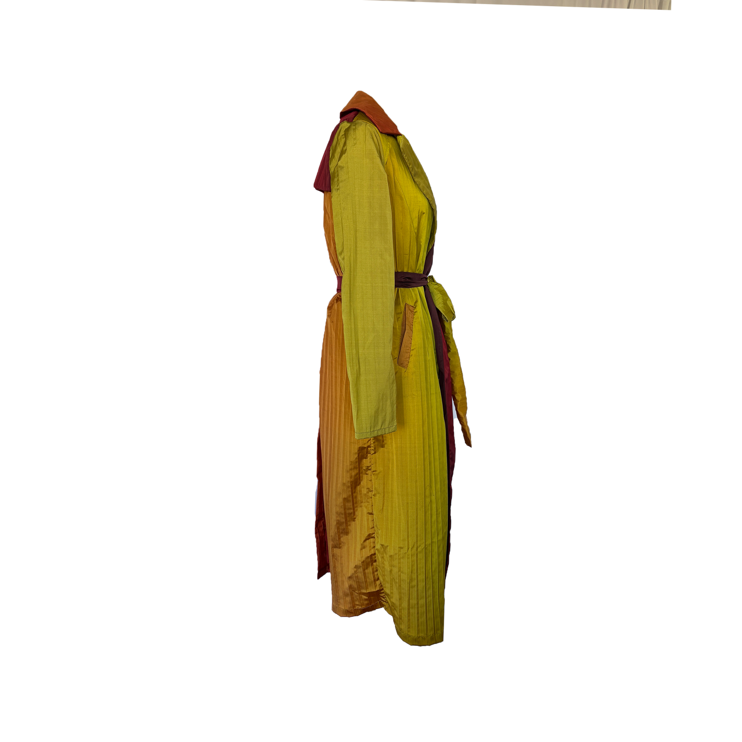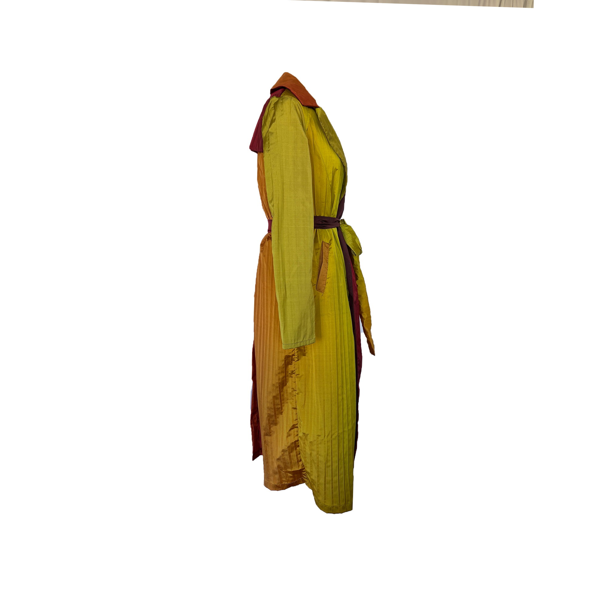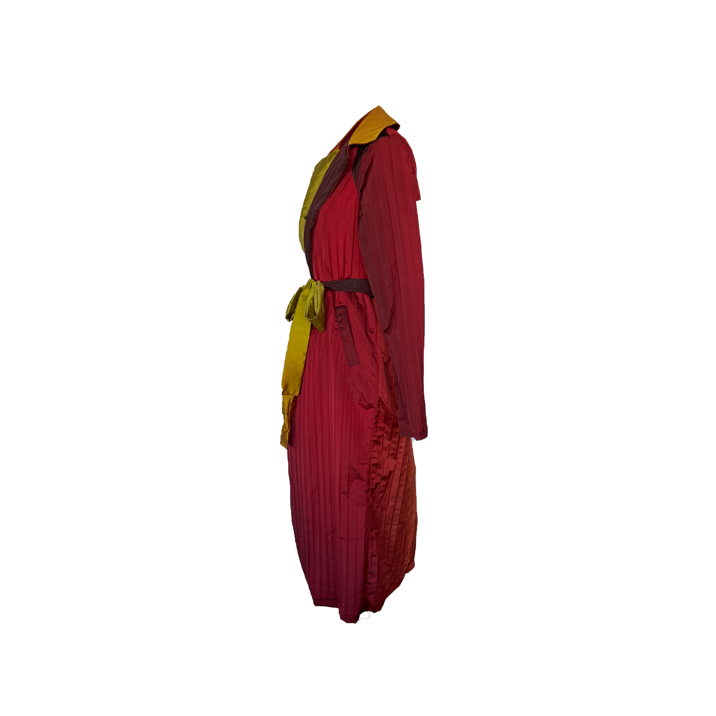 The Iris Trench Coat is a lightweight ombre pleated duster, that can be worn from day to evening. It is shaded from red to yellow, and the color folds in a random beautiful manner. Perfect for layering in the spring, add this piece to your collection today!