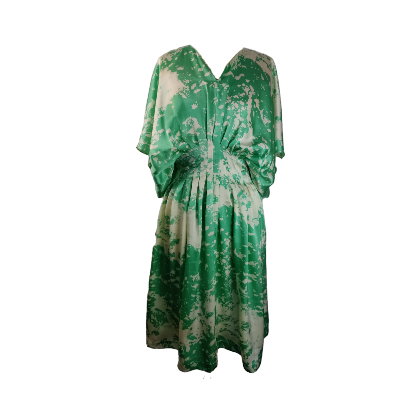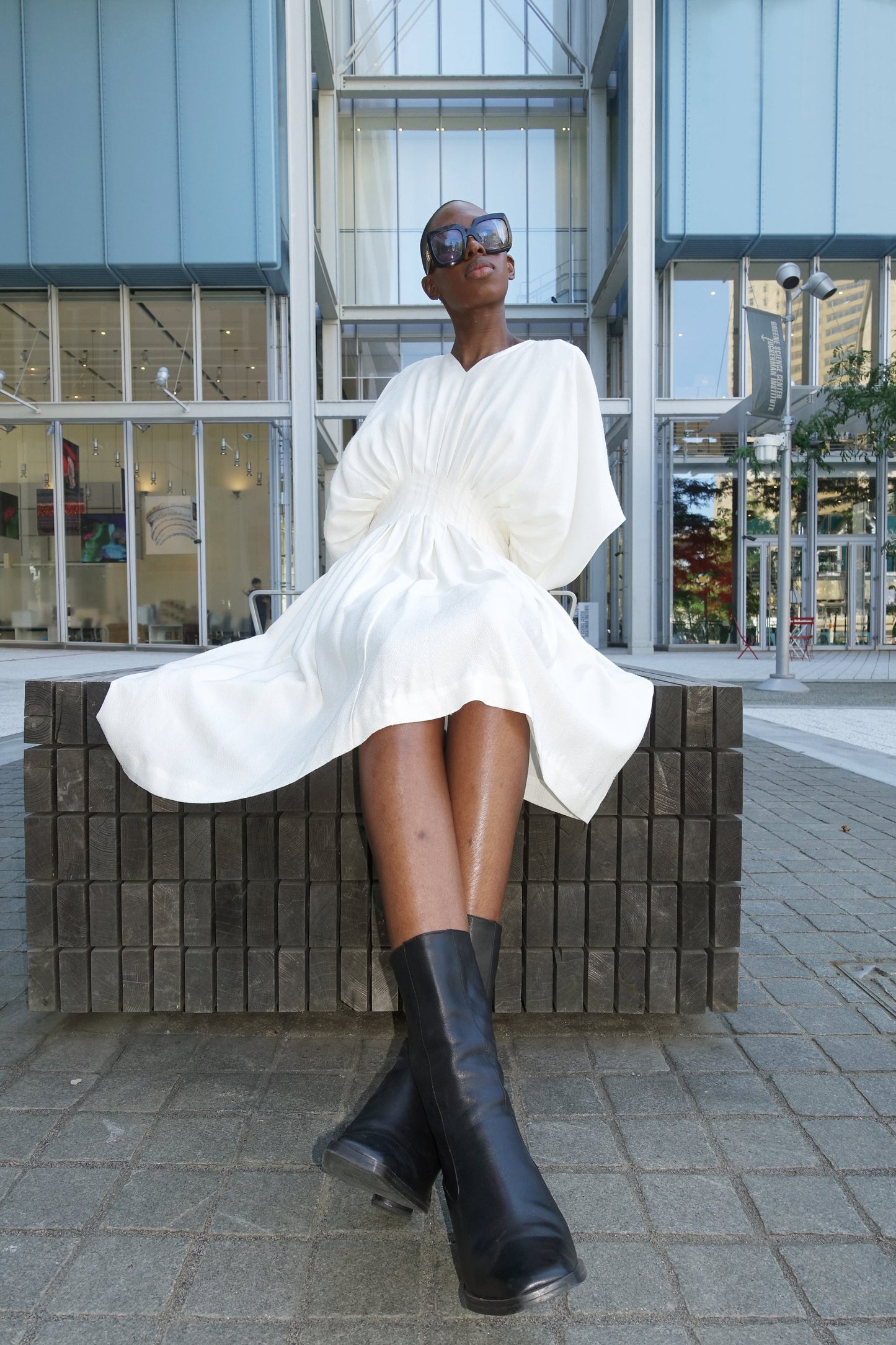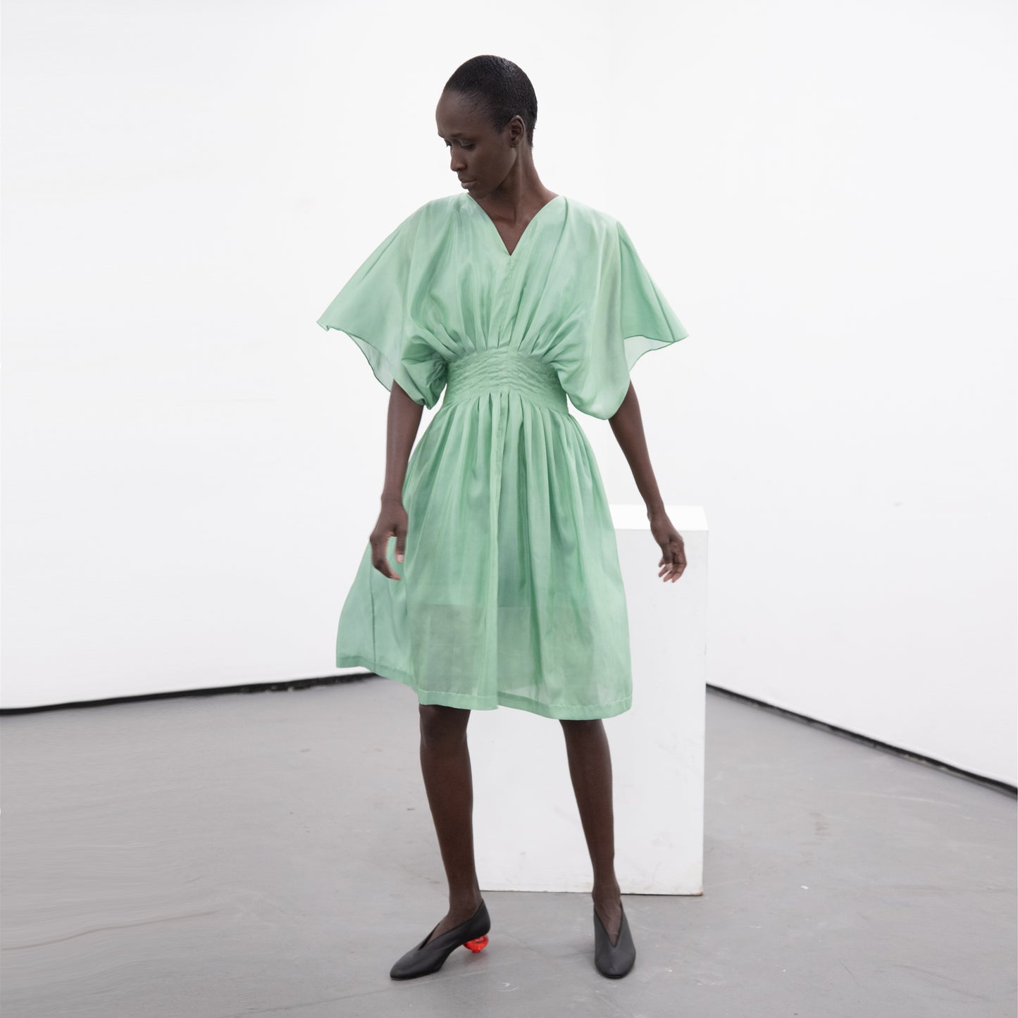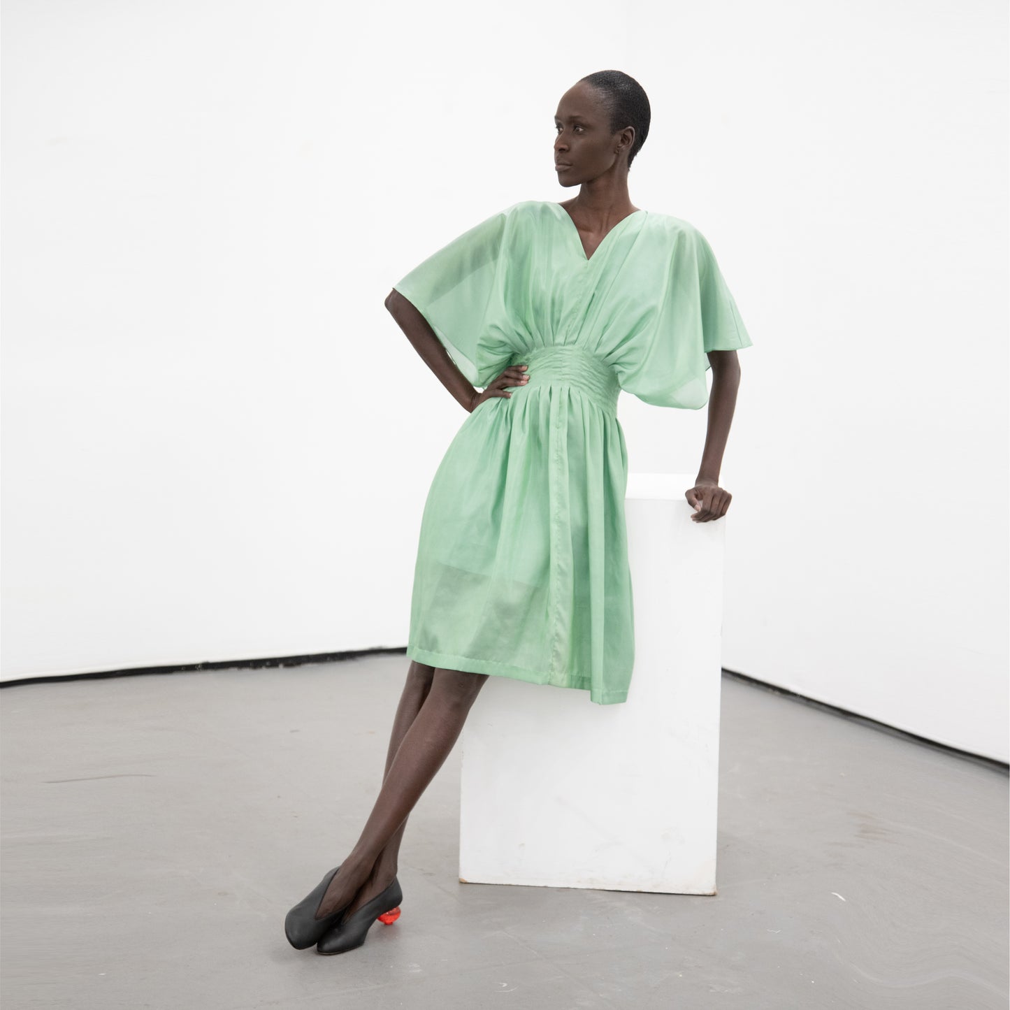 Loose-fitted V-neck line dress with fluttering sleeves that are shaped with architecturally constructed darts in a corset waist. A dress for a summer night breeze.