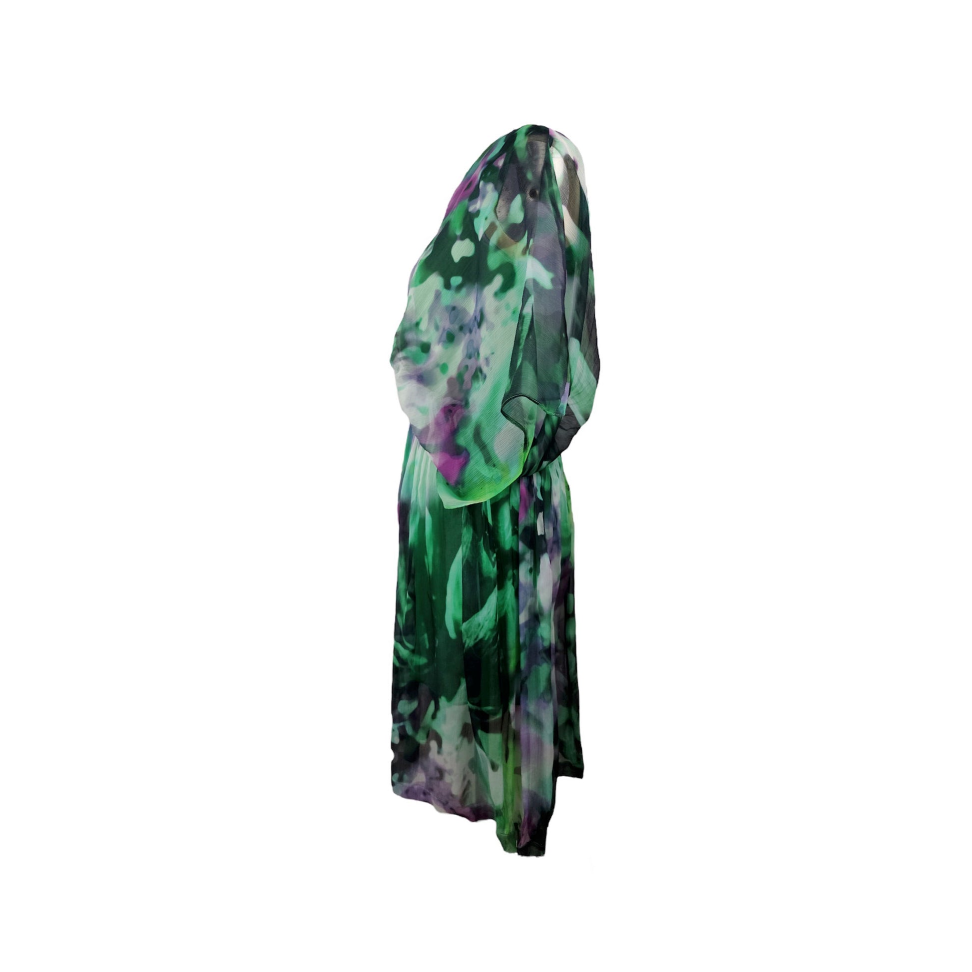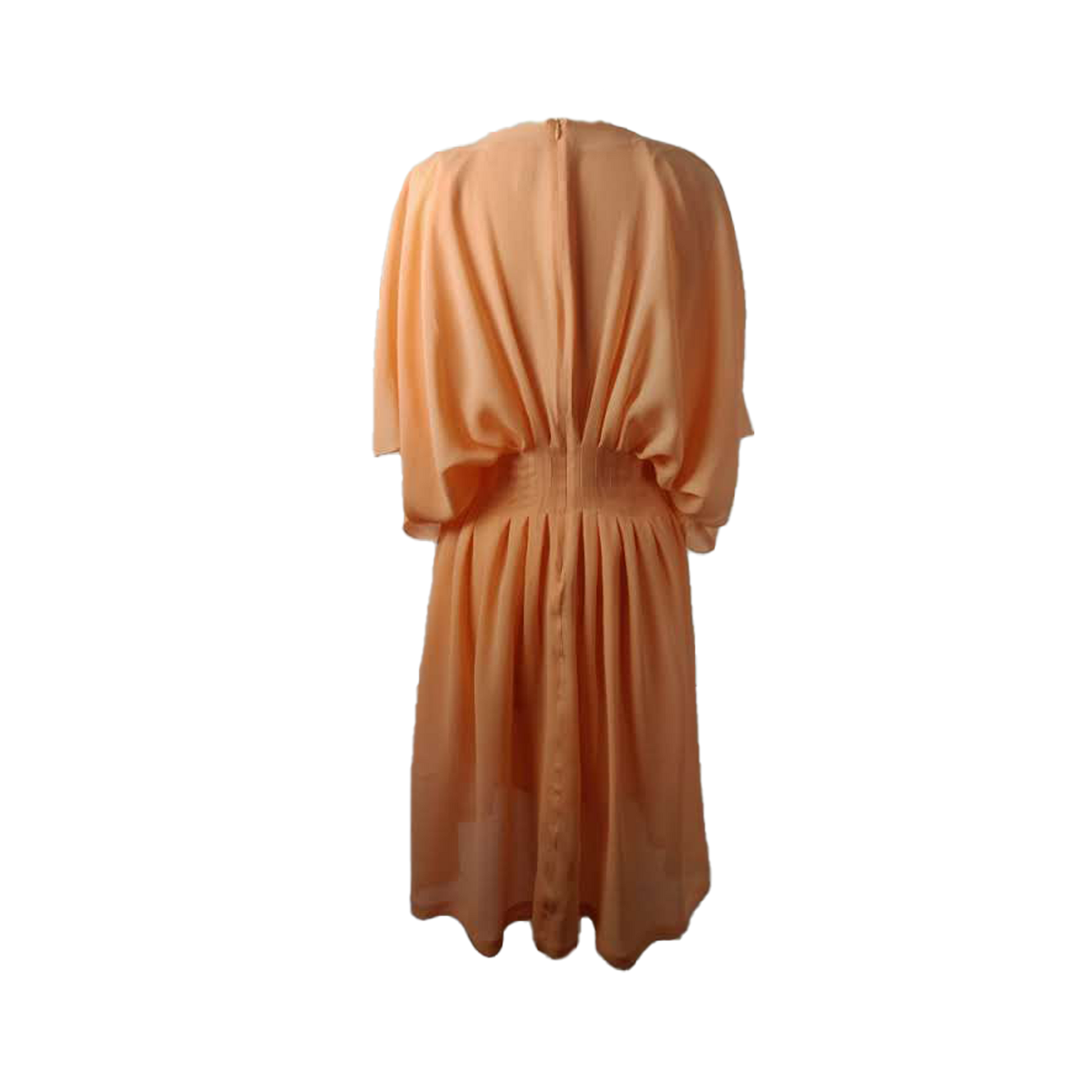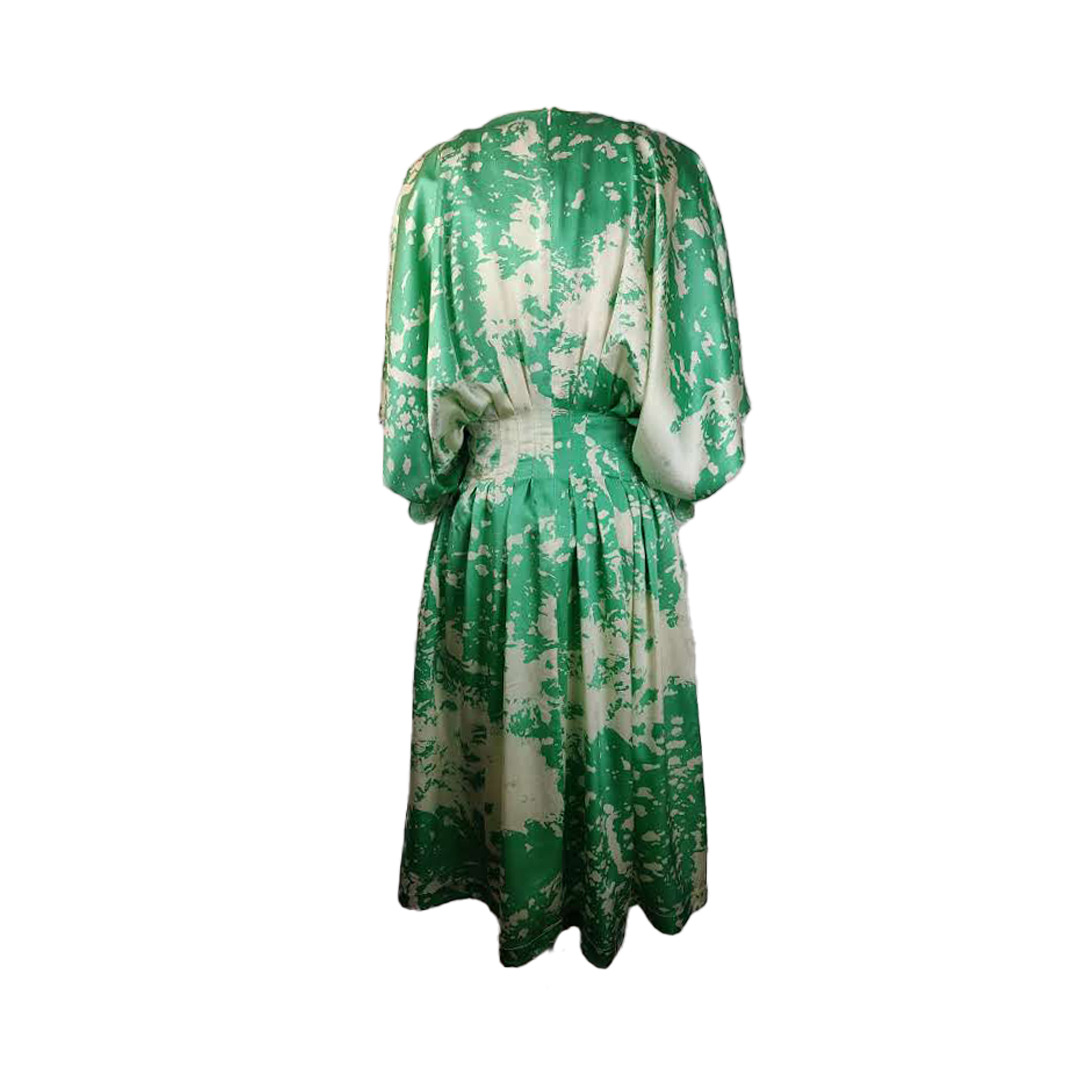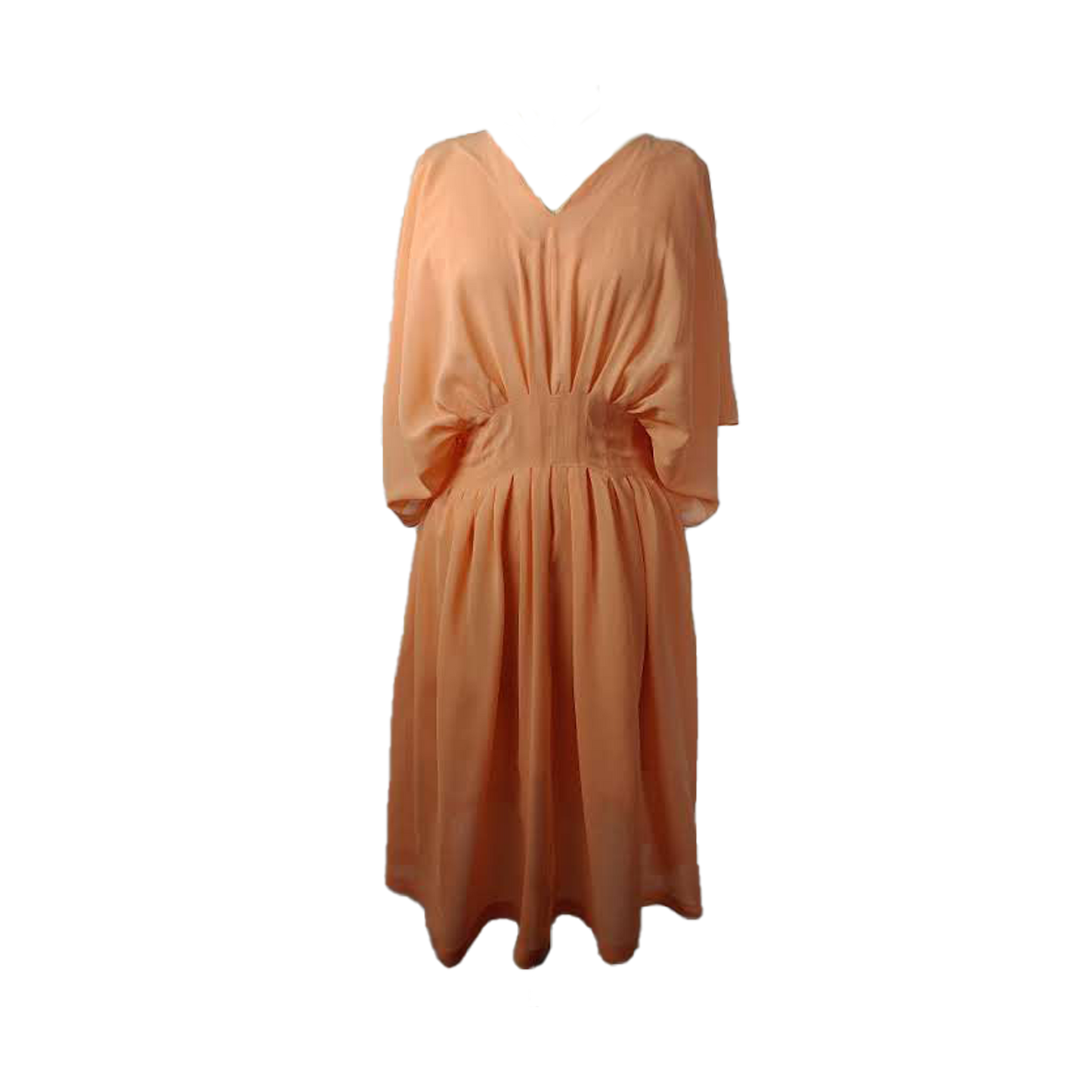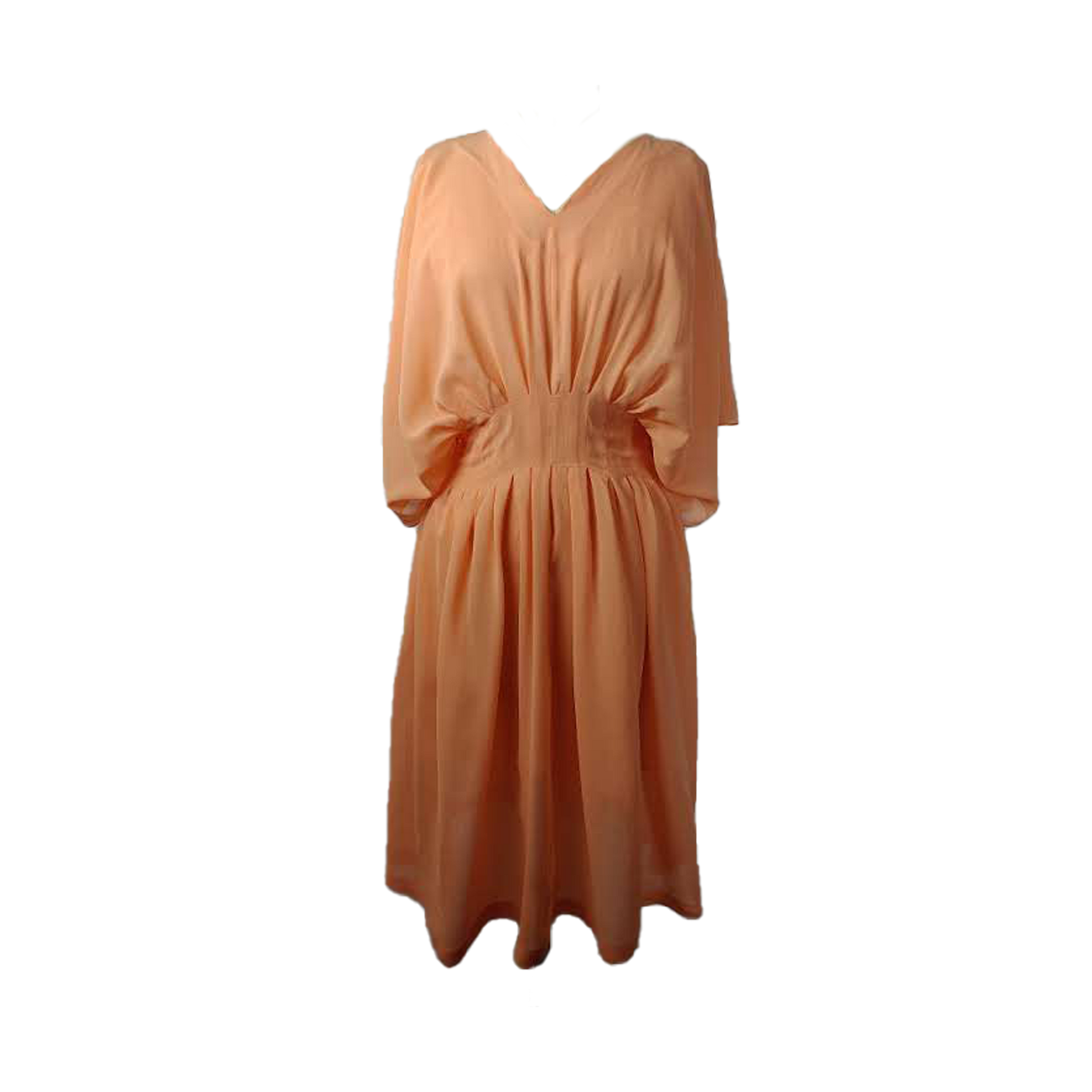 Loose-fitted V-neck line dress with fluttering sleeves that are shaped with architecturally constructed darts in a corset waist. A dress for a summer night breeze.