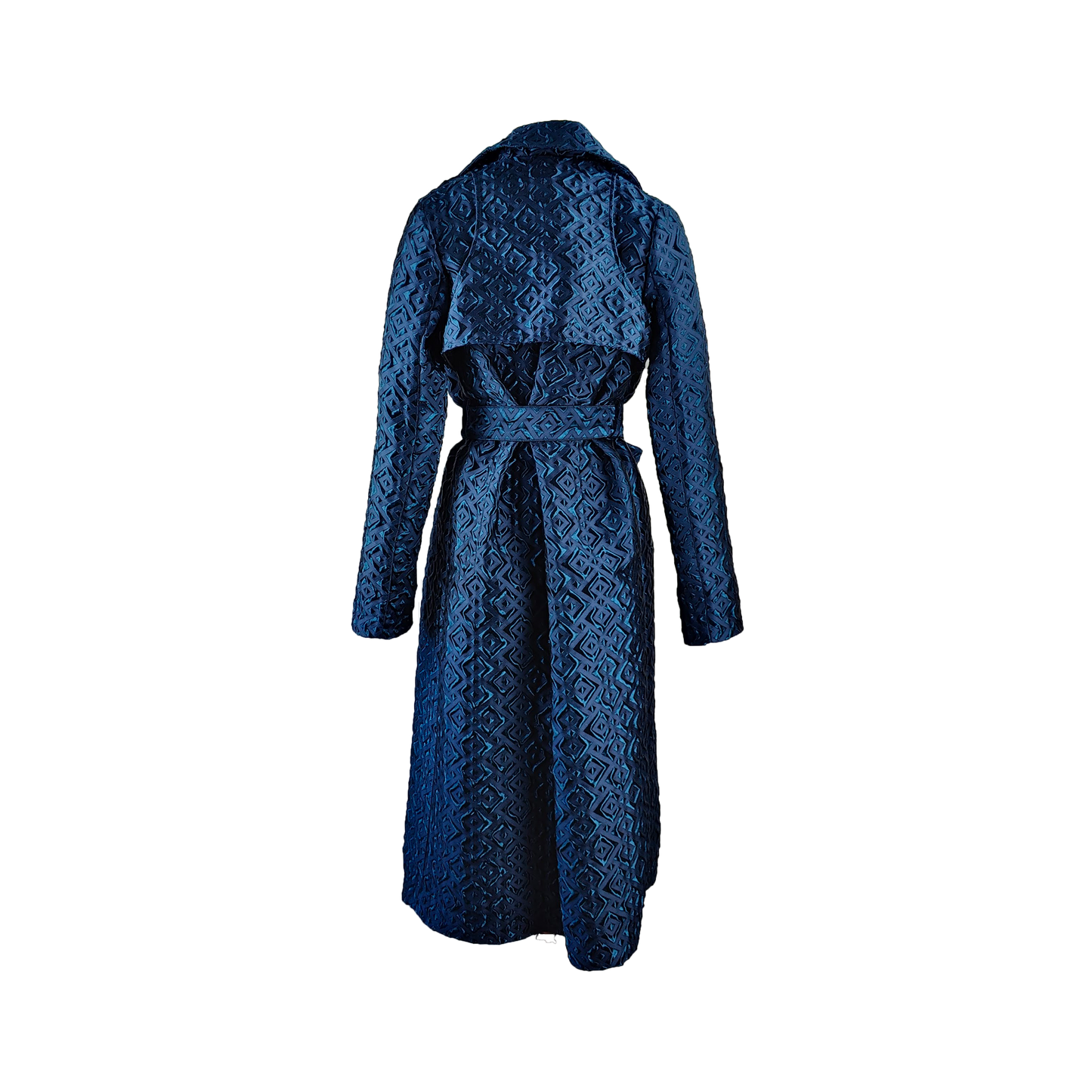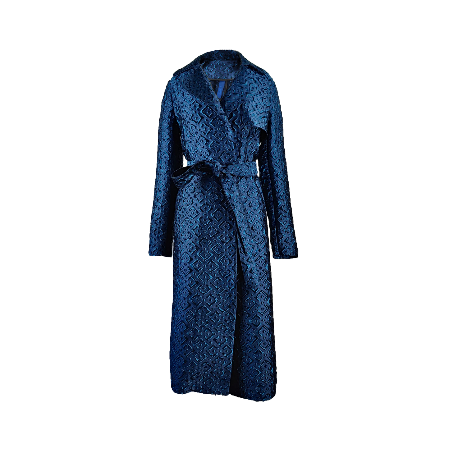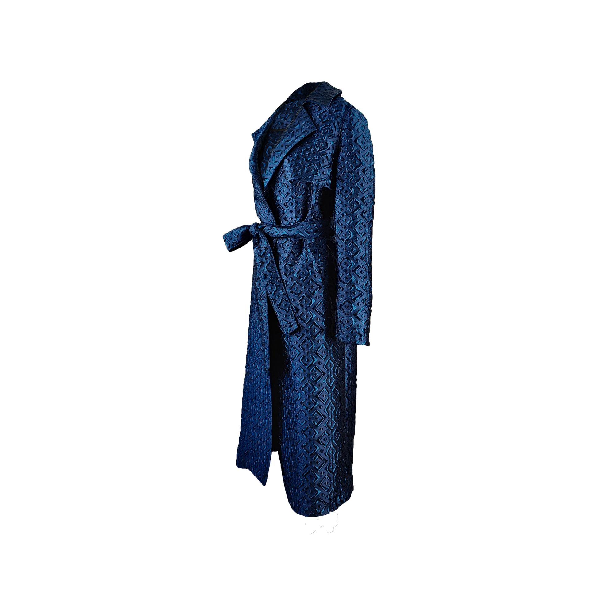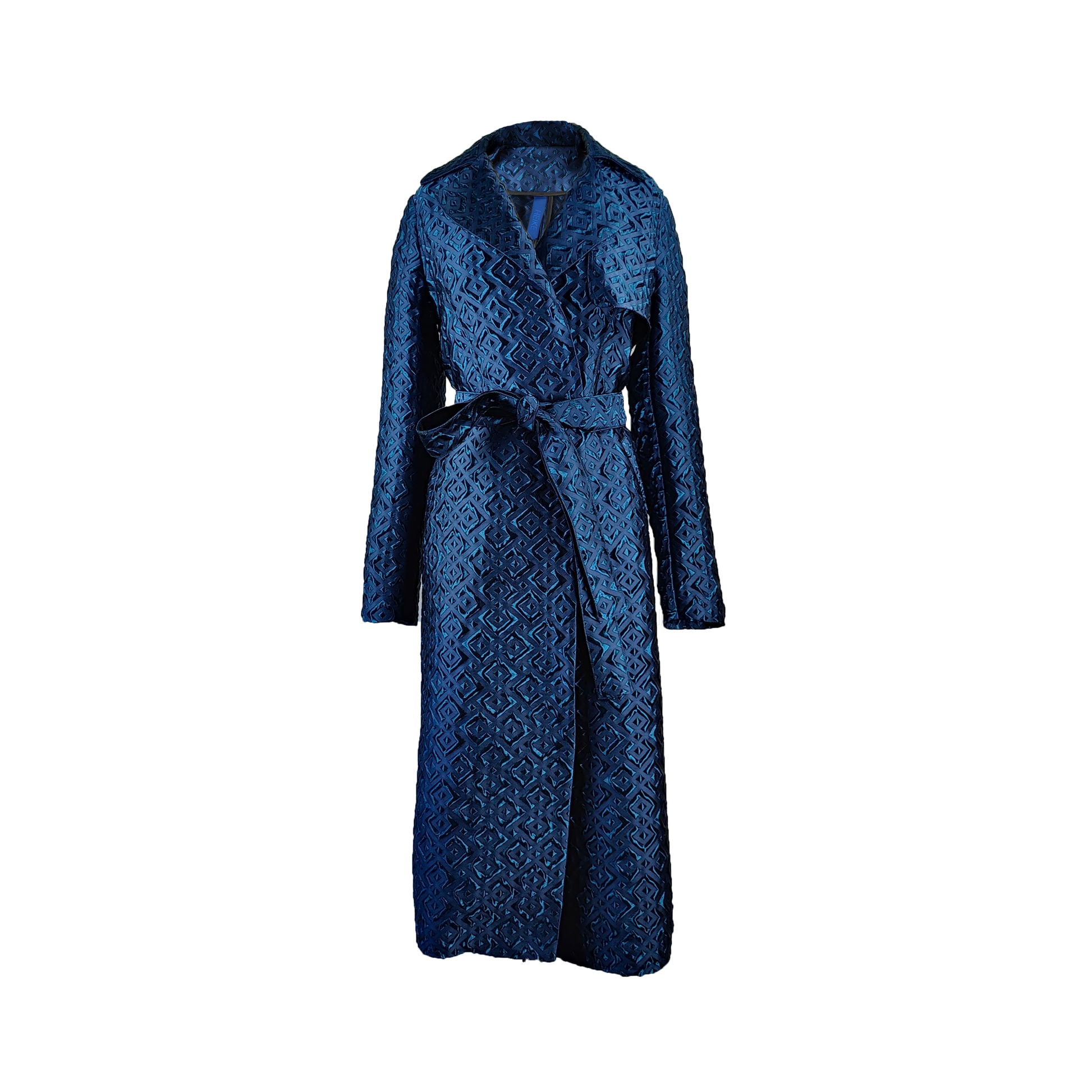 The Ubut coat is a perfect blend of artistry and modern sophistication. Crafted from 100% premium polyester, this coat showcases a striking blue geometric pattern that exudes contemporary elegance