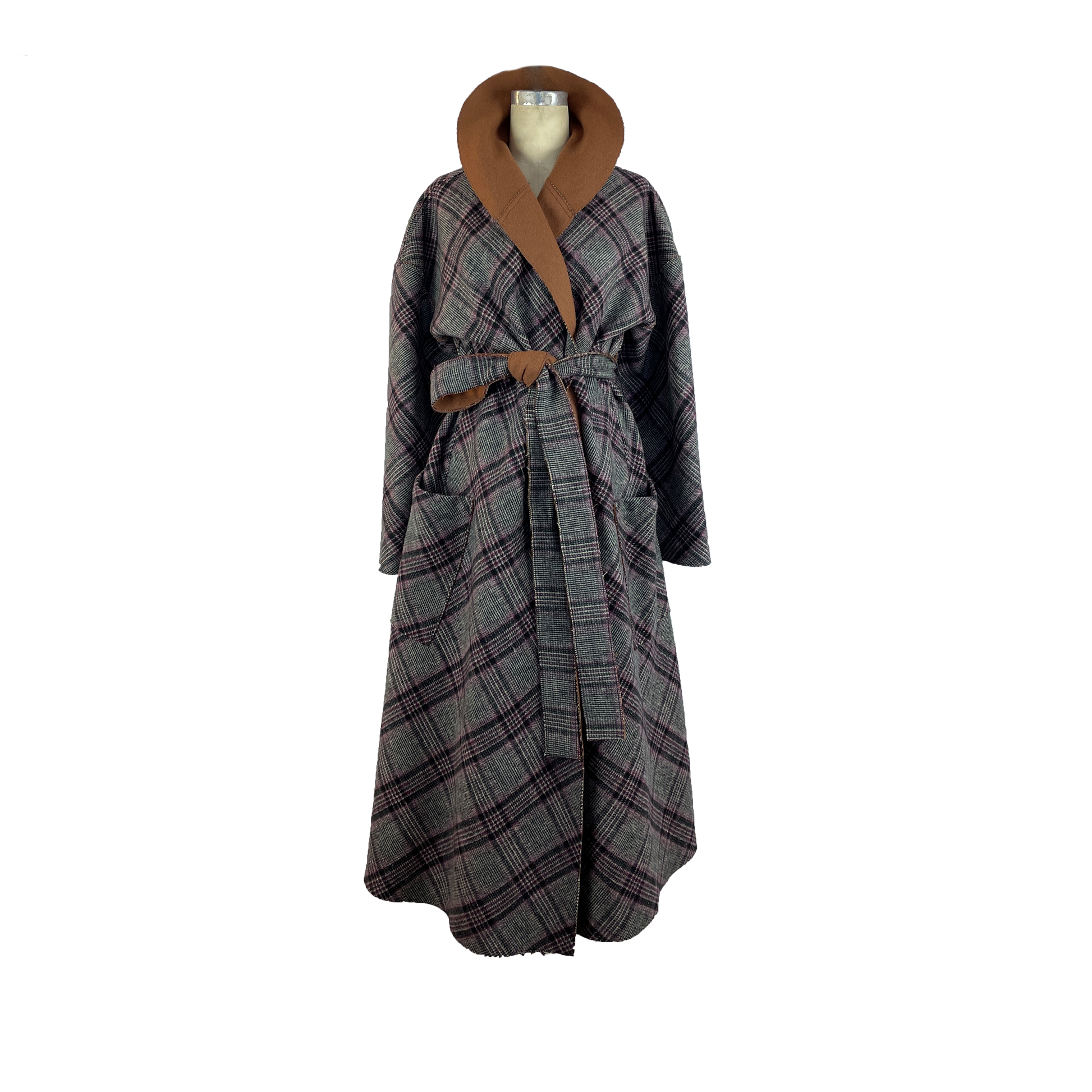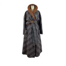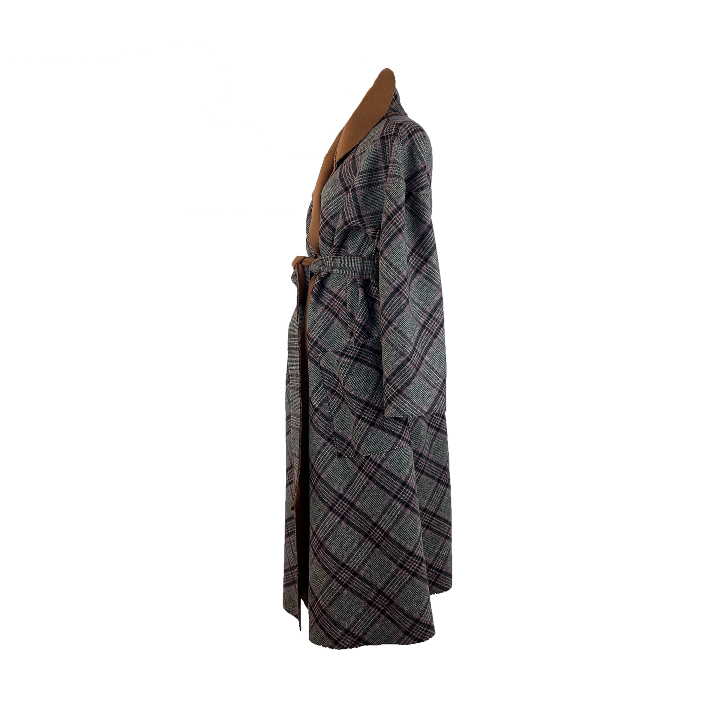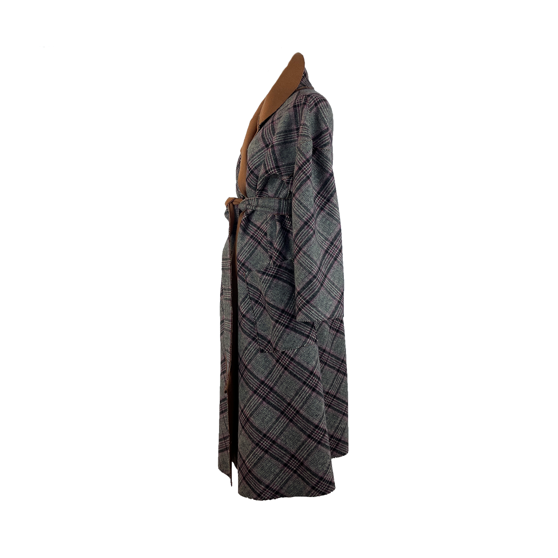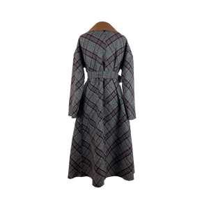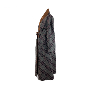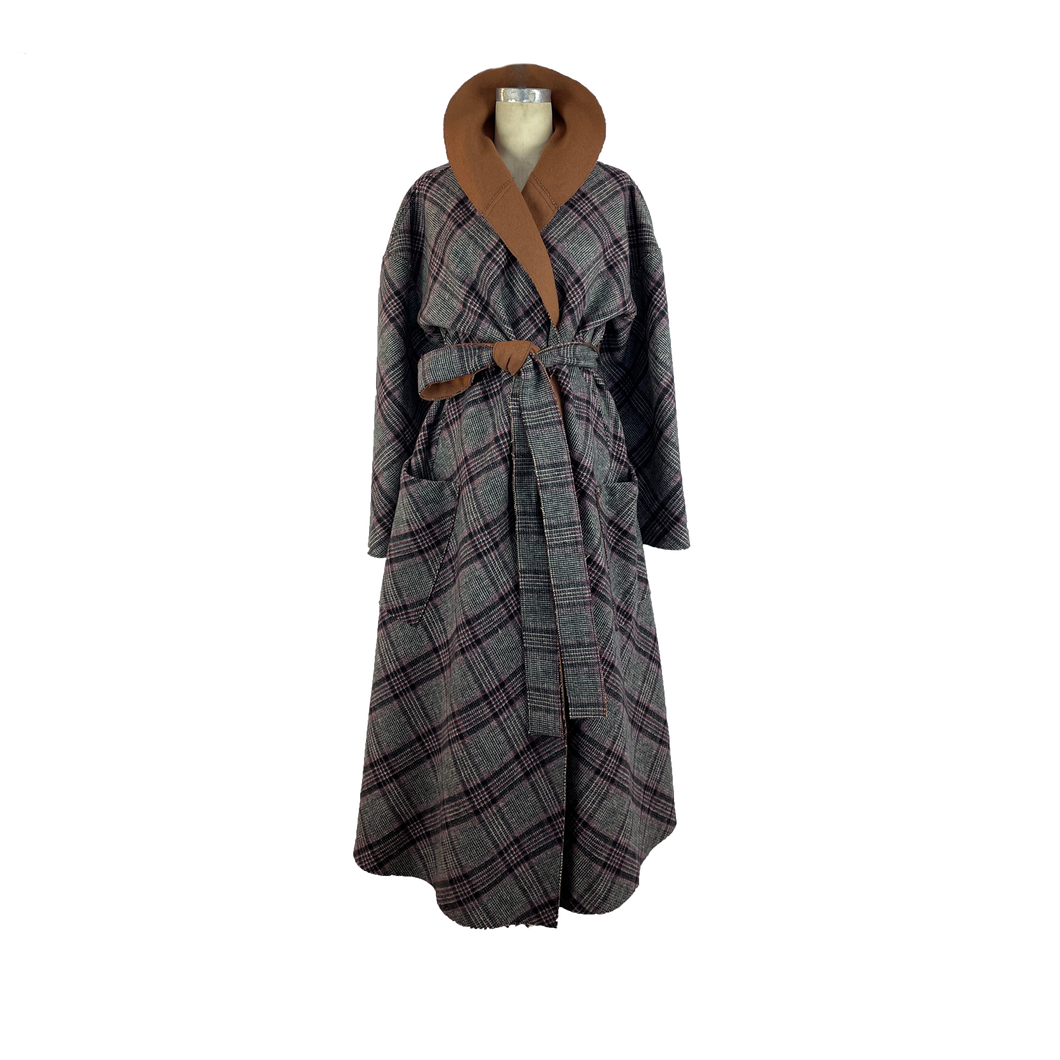 This coat is cut from a gorgeous double-face fabric in plaid on one side and pecan brown on the other. With a loose silhouette, secure the coat with the self tie belt for a cinched shape. It is reversible.