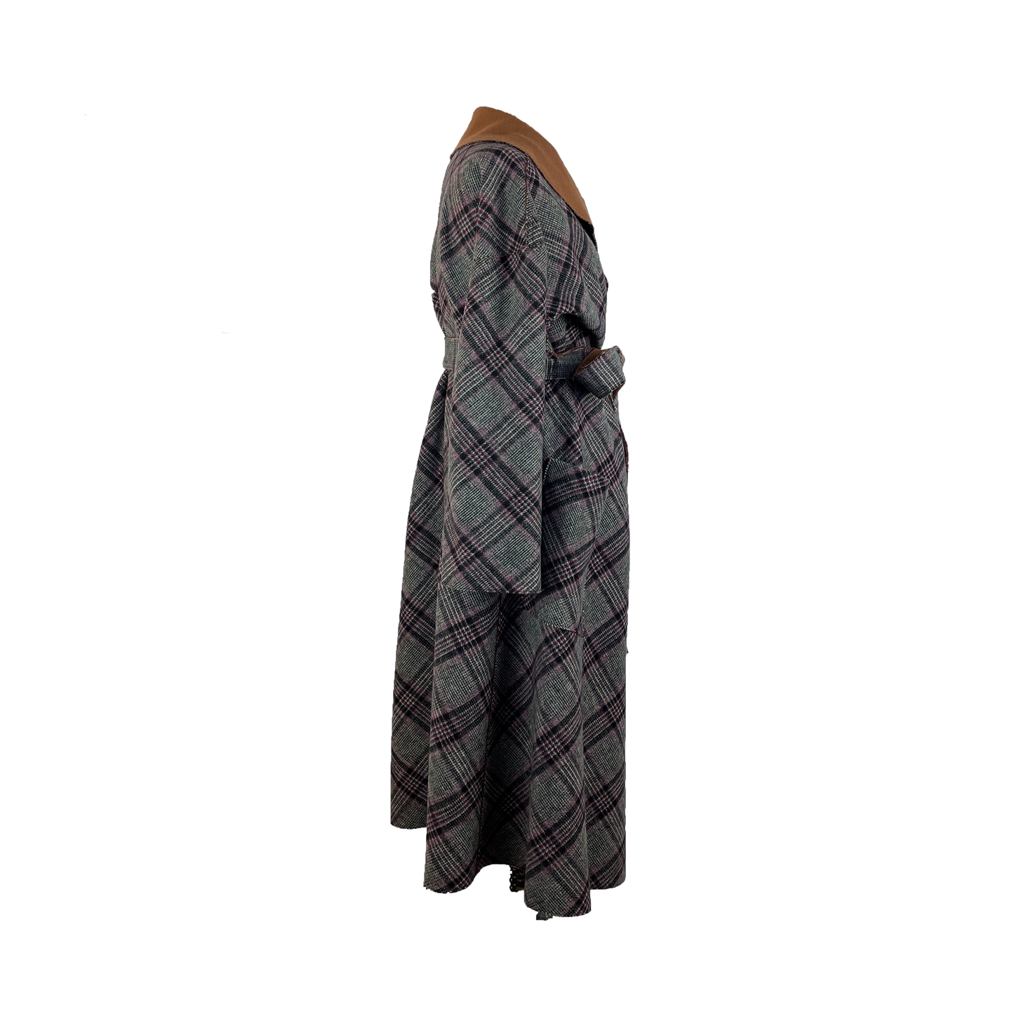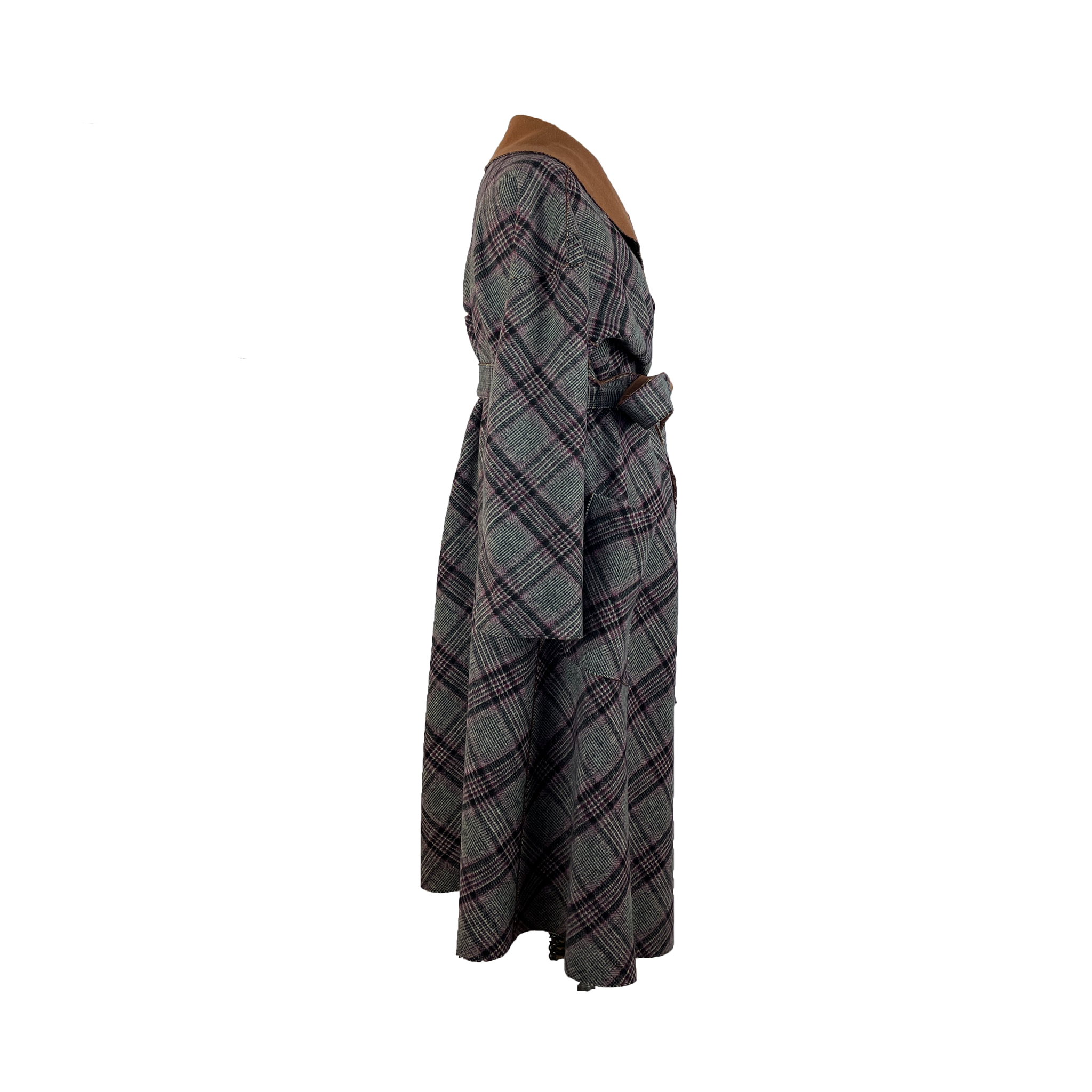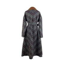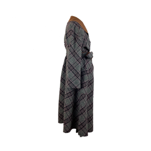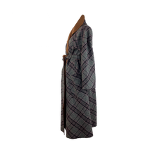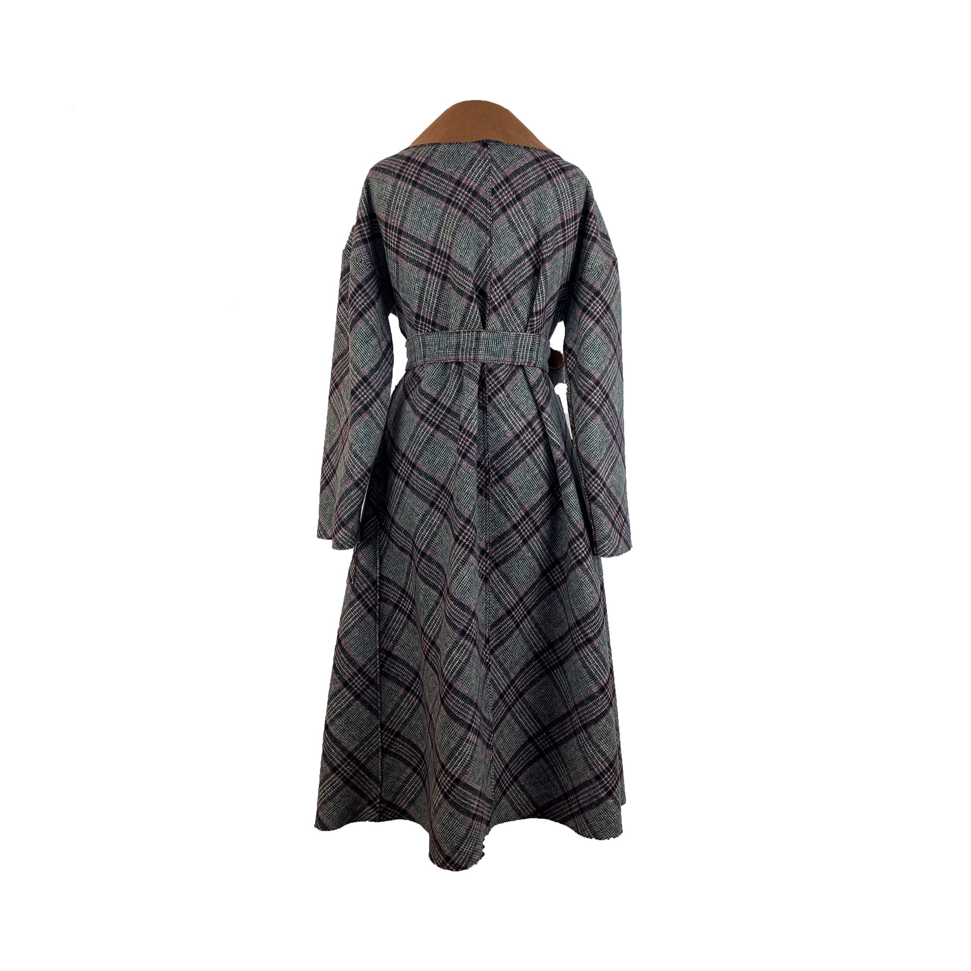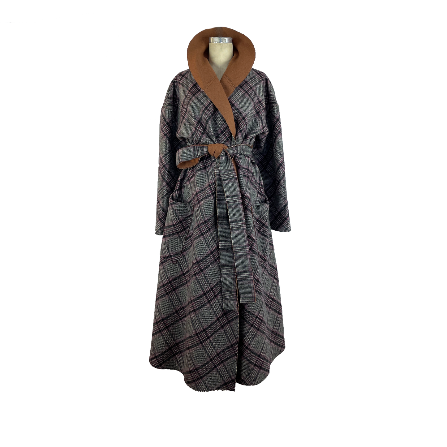 This coat is cut from a gorgeous double-face fabric in plaid on one side and pecan brown on the other. With a loose silhouette, secure the coat with the self tie belt for a cinched shape. It is reversible.